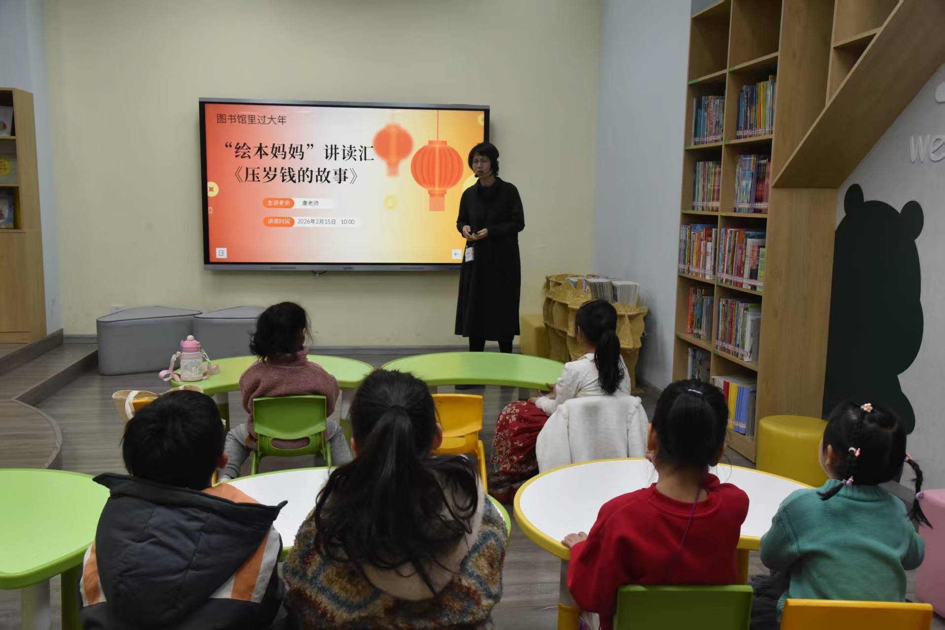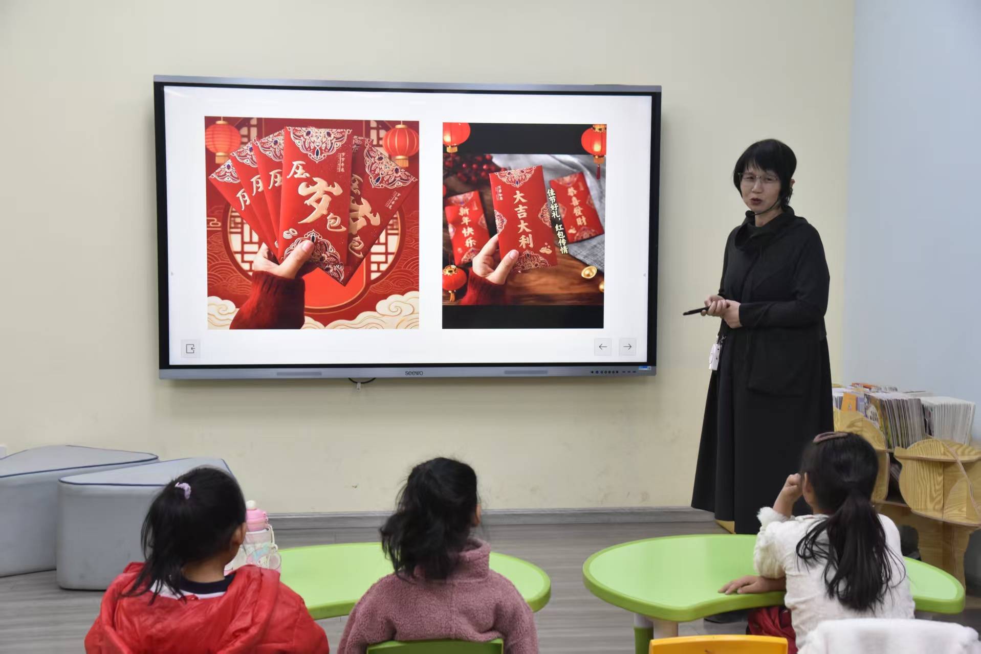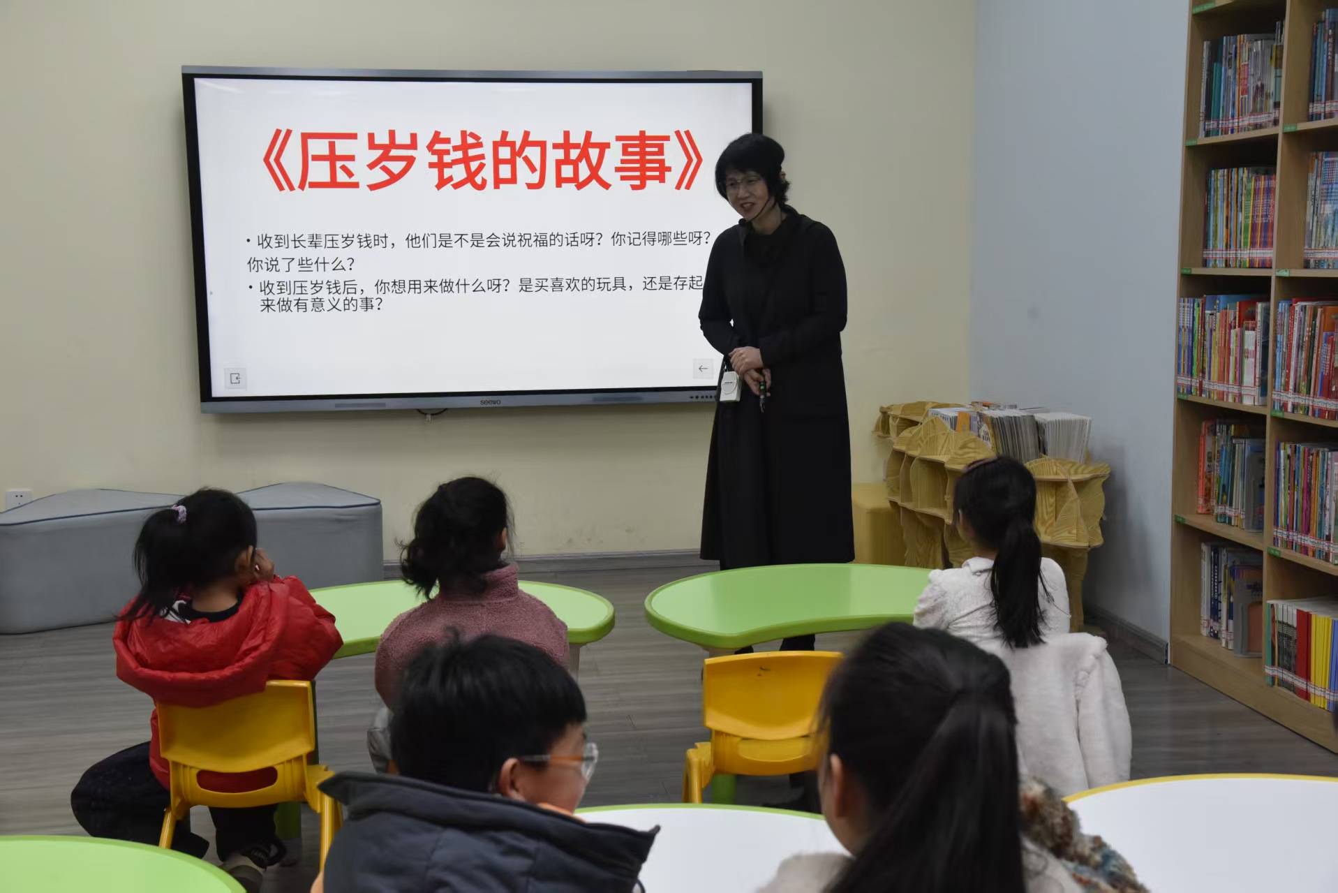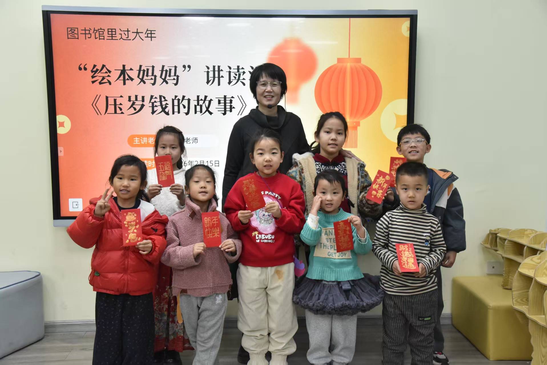 今天上午去市图书馆给孩子们讲绘本《压岁钱的故事》,并跟孩子们一起做了红包拓印的亲......