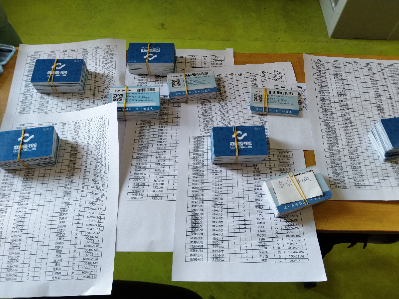 我们把卡号按各班级名单分类出来,交给校方的邵老师。发卡过程中发生了个小插曲,三年级二班老师来找卡,说邵老师那里没有三年级二班的卡。几经核实,原来是学校上报名单时不知什么原因把三年级二班漏报了。幸好经验丰富的宋昱老师带了备用卡,算算数量足够,当场就把卡给补上了。