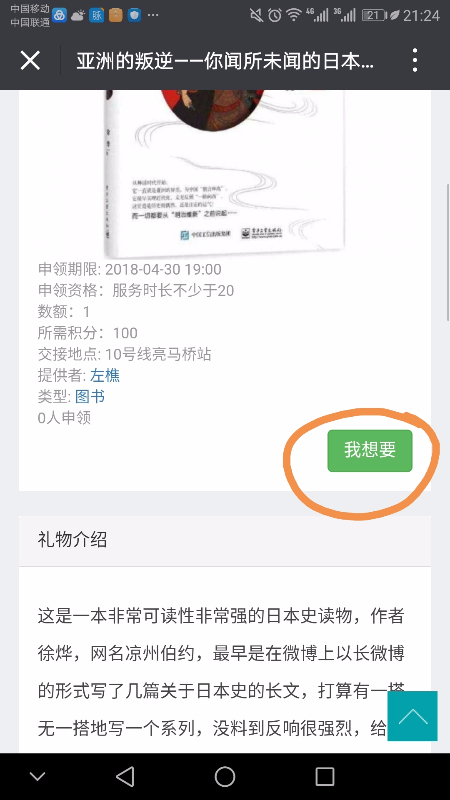 2018-04-12 09:00至20:00服务8.0小时,开发了礼物模块,可发布礼物,用积分换取礼物。