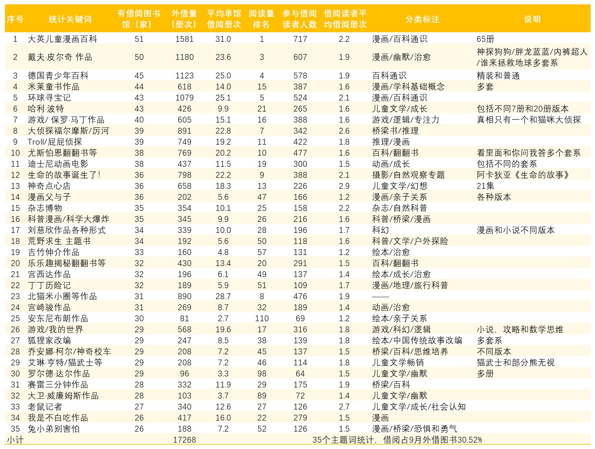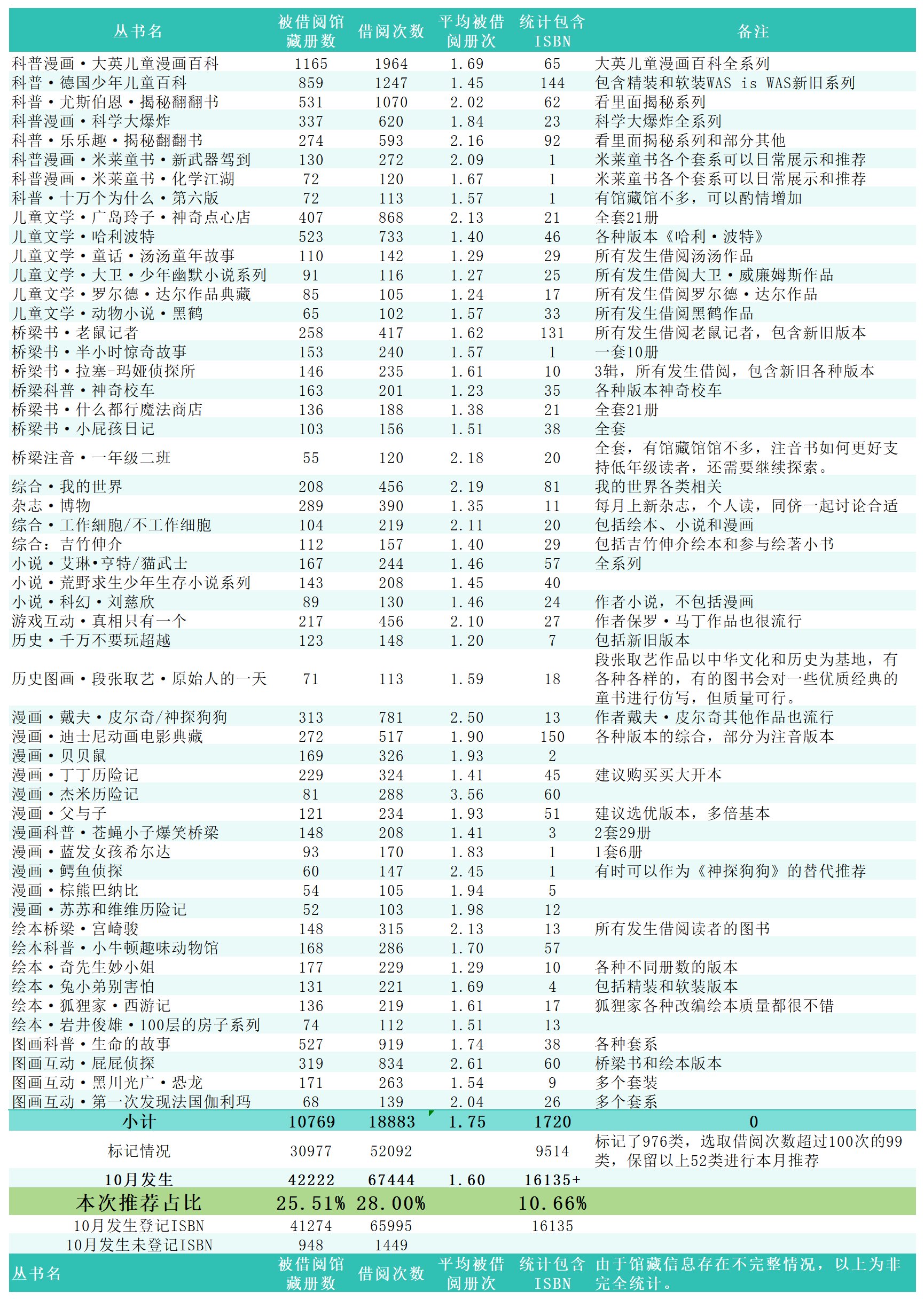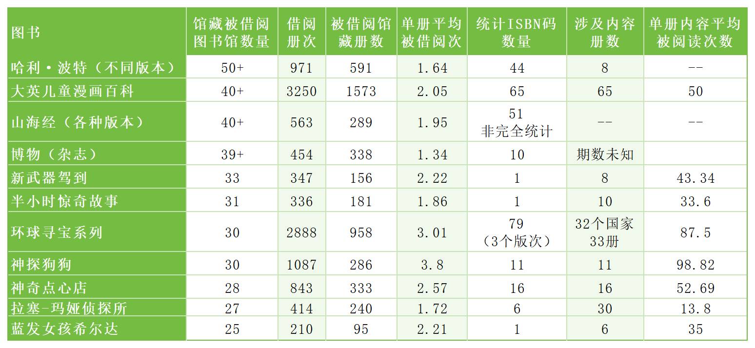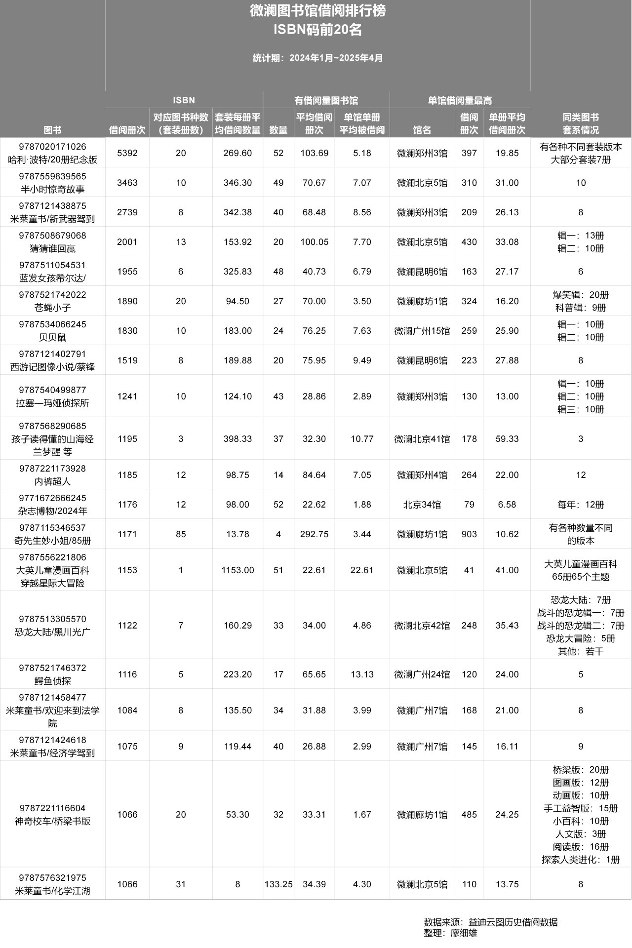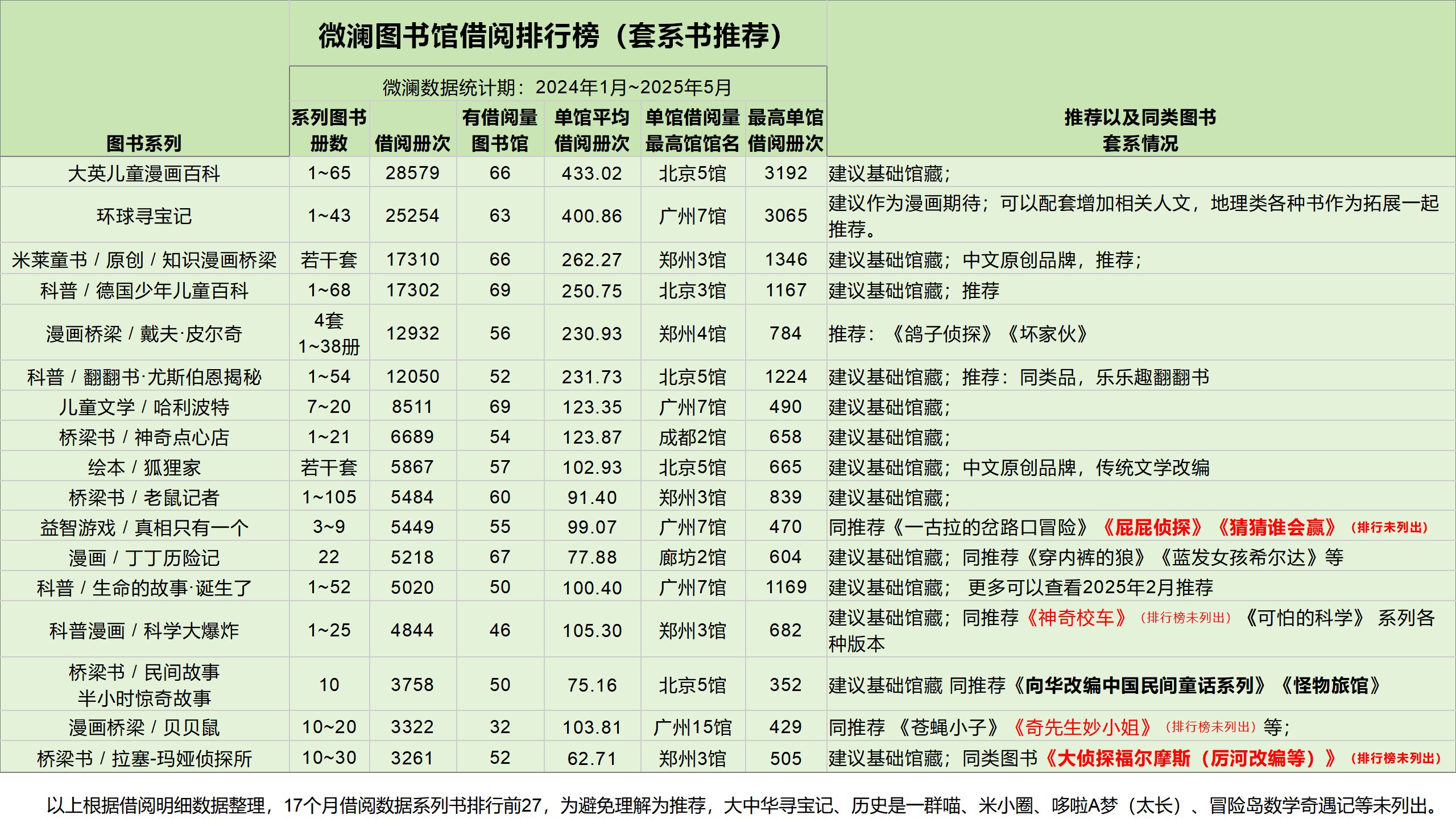 本月,统计了从2014年1月起至2025年5月17个月借阅记录,套系数前30名,下表只呈现了部分推荐基础馆藏的总体借阅情况,供各个图书馆日常开放图书推荐或者馆藏管理参考。
