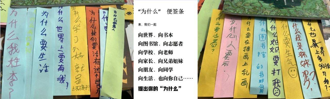 3月,在成都2馆,伙伴发起活动“好奇心便利贴”,后来孩子们的问题成了“为什么展”。在微澜社区成都2馆小组服务区或小红书@成都微澜公益图书馆可以查看详情。受到启发,北京5馆发起了“为什么”便签条提问的活动,短短几个课间,孩子们发出了很多生命之问。