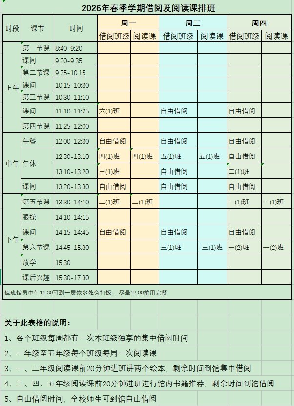 2026年春季学期借阅及阅读课排班(点开正文看课表)