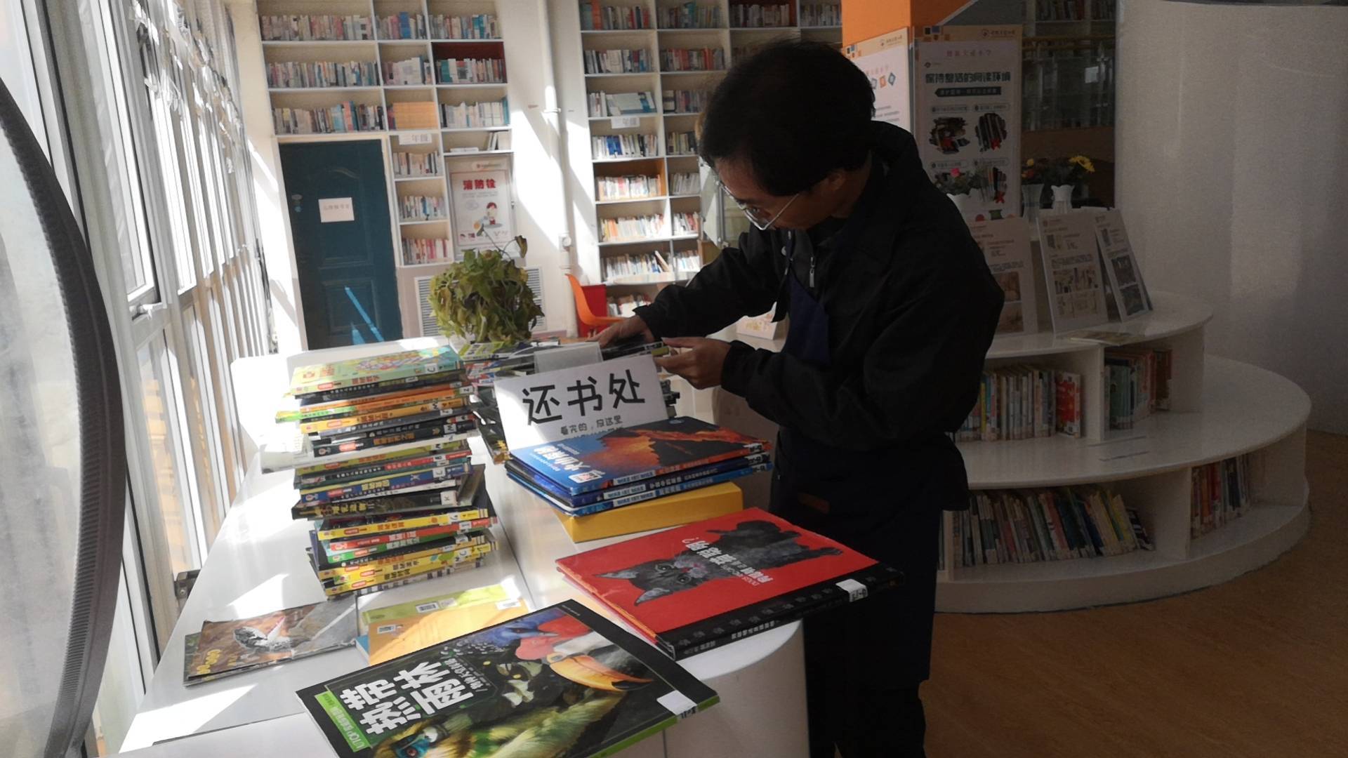 新朋友杨晶来馆,一见如故。借还书、整理书架,跟孩子们交流,行云流水。