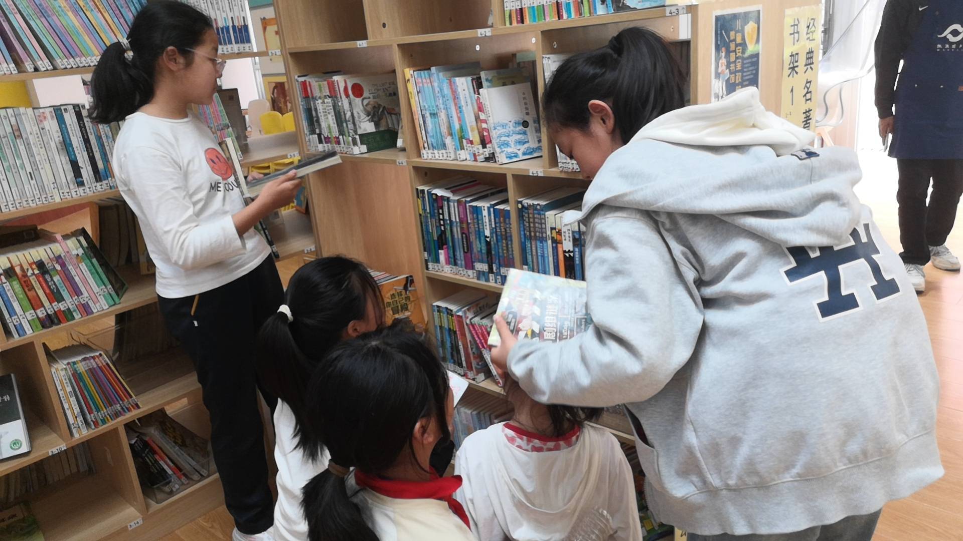 今天来借书同学不多,三位志愿者有条不紊地给孩子们借还书。刚上架的《米吴》被一抢而空,看来是孩子们喜爱的书籍啊。