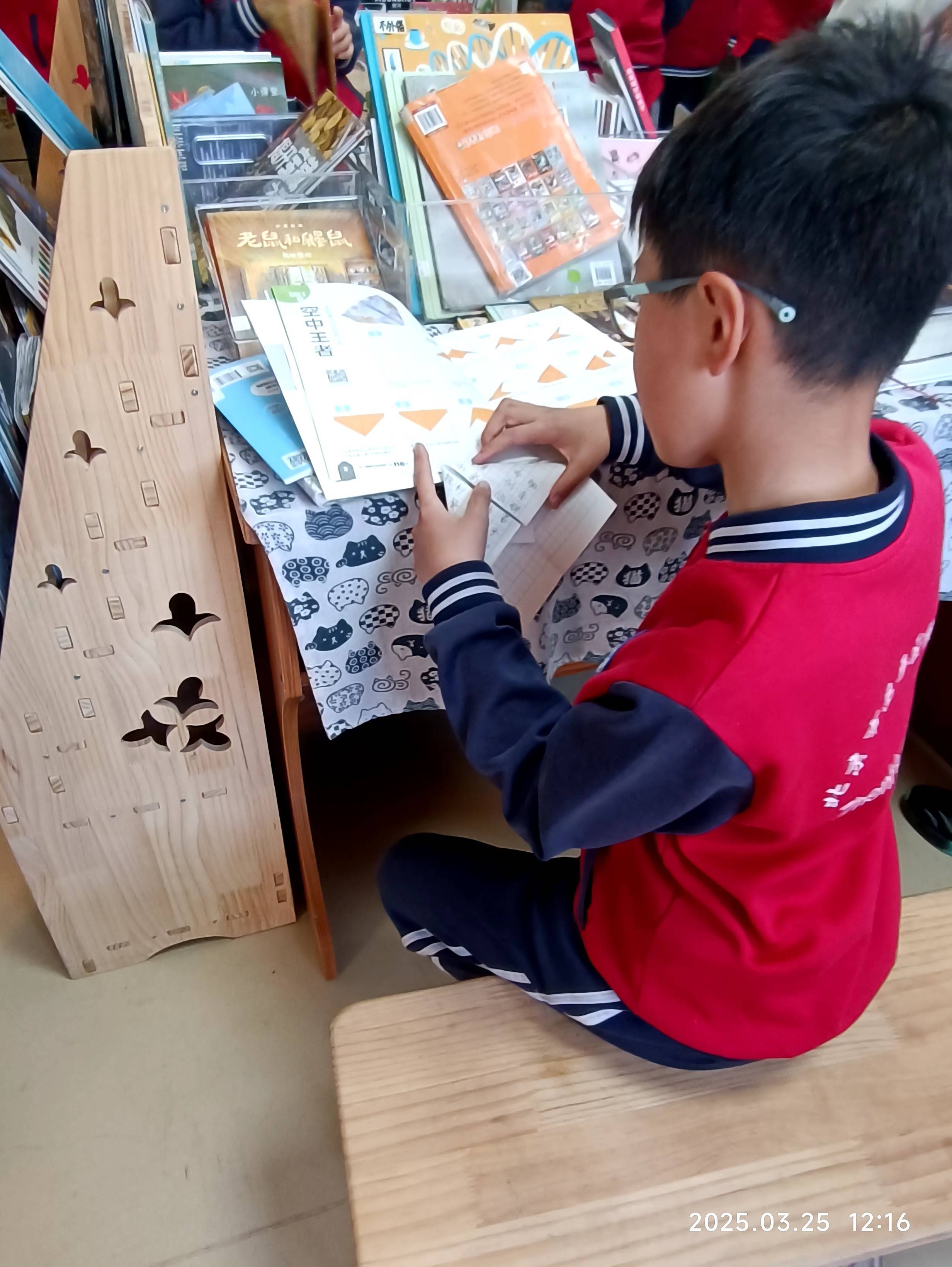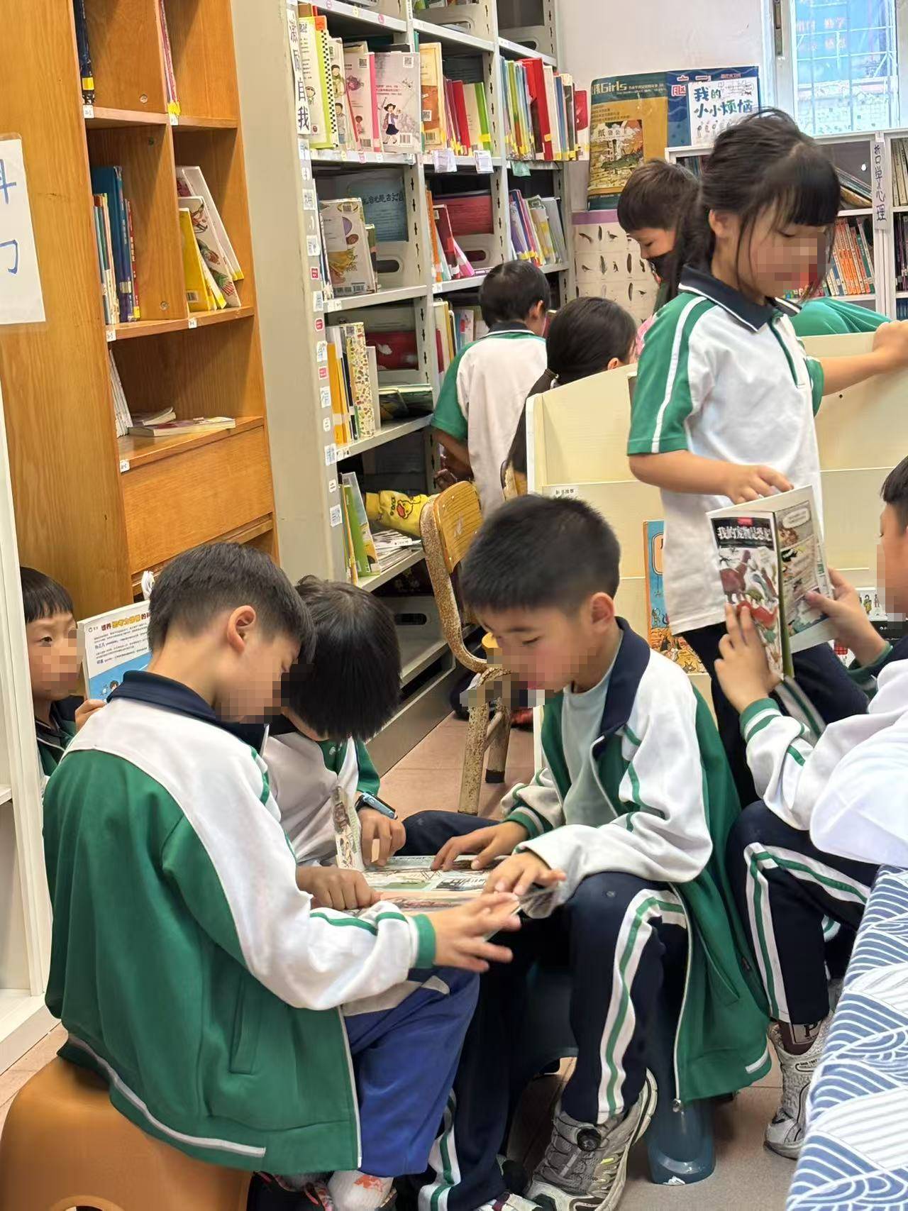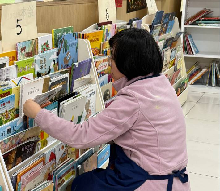 小朋友们热情高涨,一瞧见掉落的标签,就像欢快的小鹿般蹦跳着跑过去,主动将其粘贴归位 。完成之后,他们眼中仍闪烁着兴奋的光芒,意犹未尽,紧接着又投身到整理书架的工作中,小小的身影在书架间忙碌穿梭,不一会儿,书架就被收拾得整整齐齐。