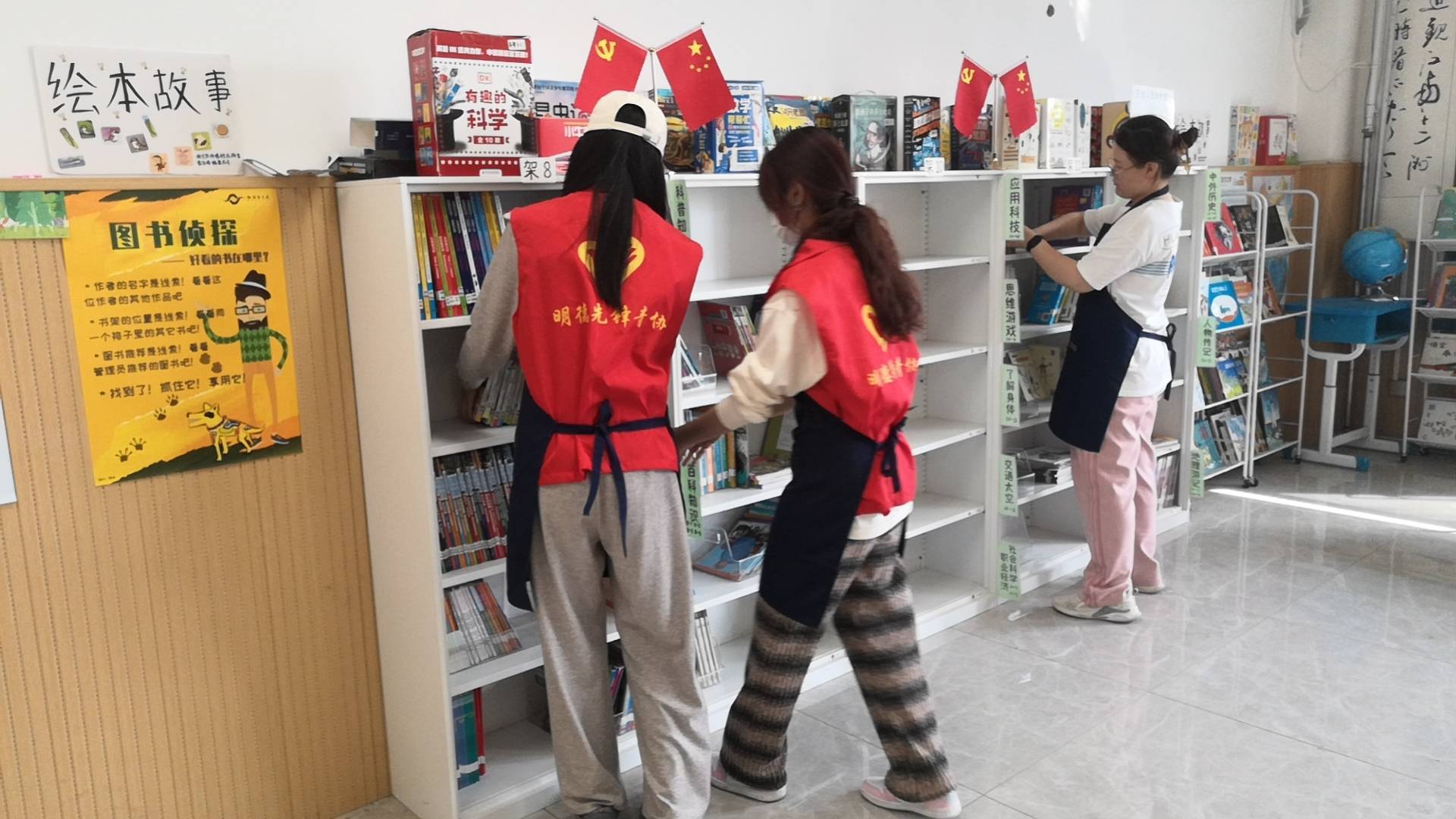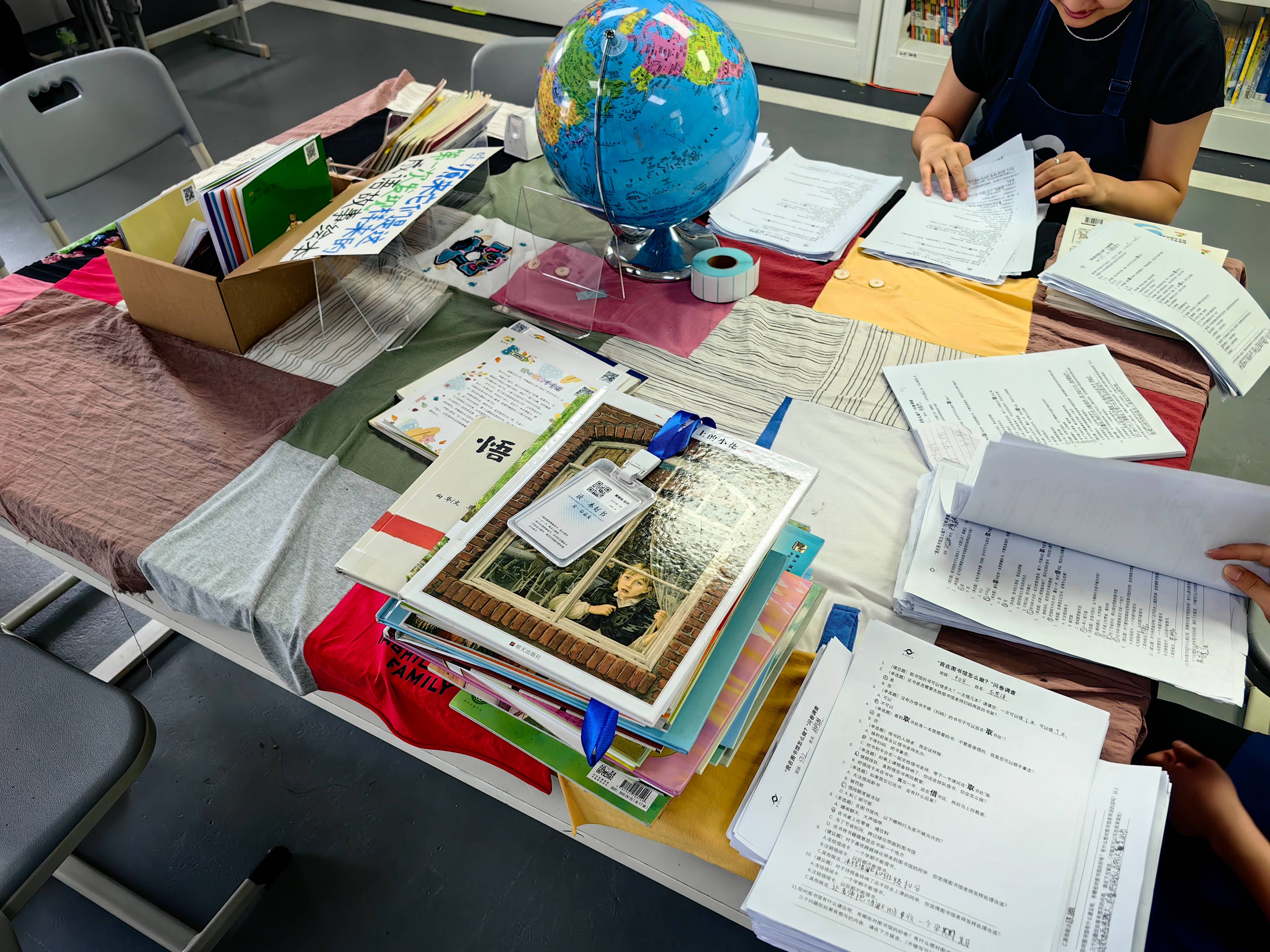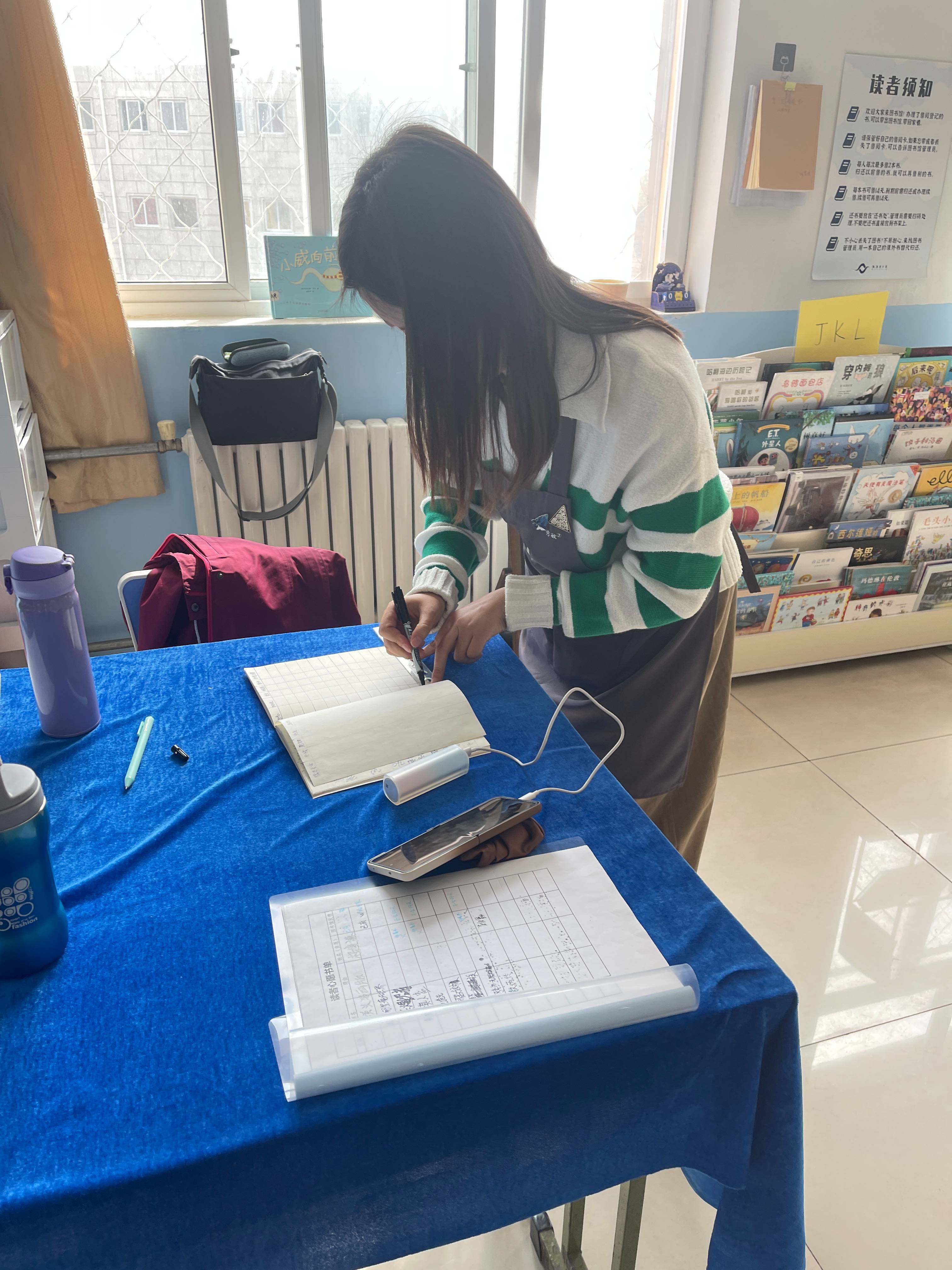 第一次和荣姐一起在29馆值班,等我到达的时候,荣姐都已经把一切布置妥当,勤快又利索。约定好的班级都按时有序来还书借书,间杂着询问活动、提交作品、等待盖章,我们分工合作。
