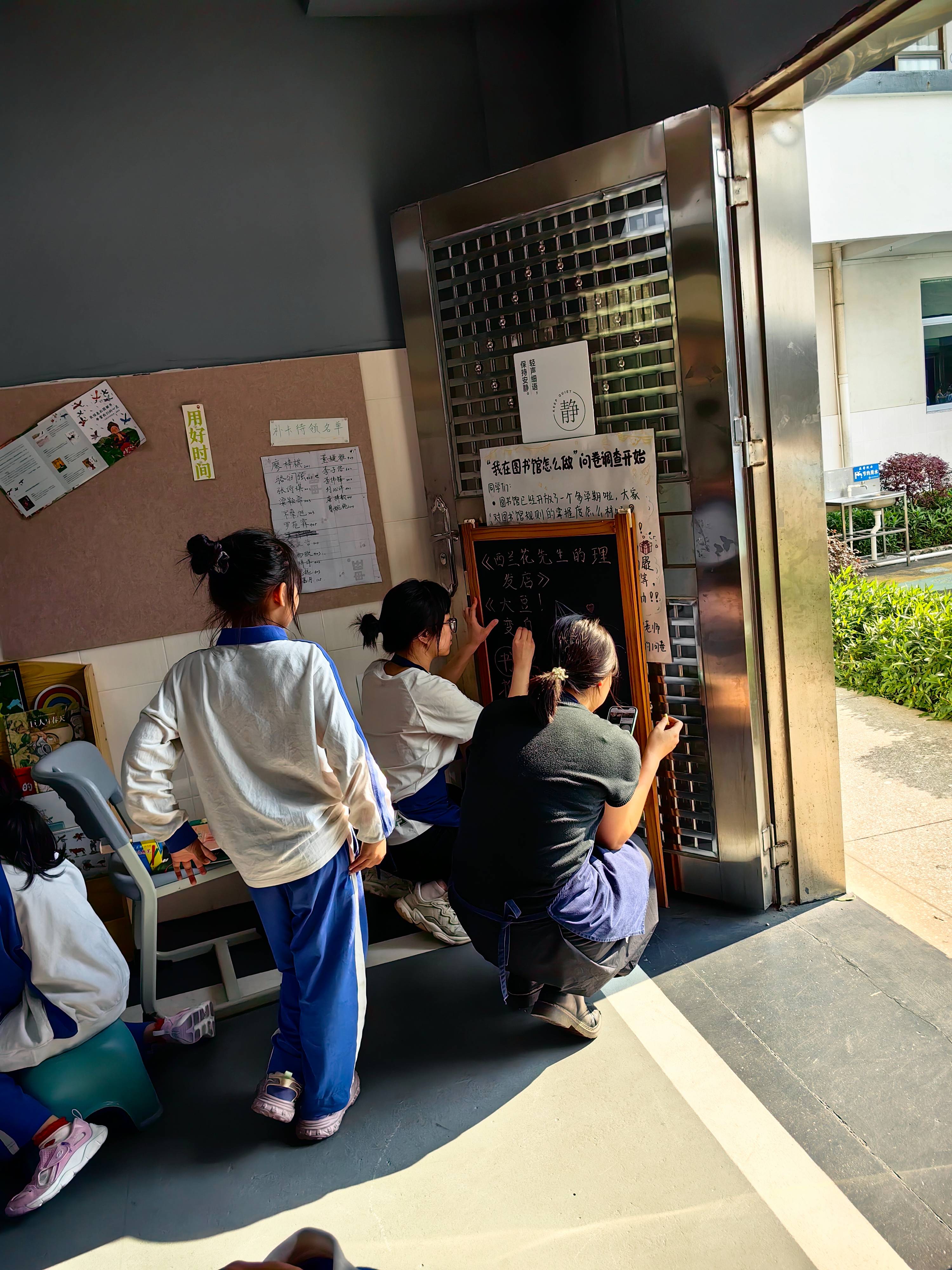 回到馆里,有个女生问,有没有那种可以在书里面做题的书。我想了想好像没有,说你去看你的练习本或者辅导材料吧。每个课间过后,图书馆里都飓风过境一样,趋势还愈发夸张。很多同学直接把书丢在桌面上就跑了。下午唐芬写了几张提示,贴在桌子上和墙上,告诉大家要把书好好归位,并且巡视现场、提示大家。稍稍好了一点,但也有趁乱就乱放书的同学。因为能通过借阅记录看到最后一个借阅者,就也支持说,看看稍稍公示一部分“乱放书”的同学,更新更新名单,看能不能稍稍震慑一下,让更多同学把书好好归架。希望有用。
