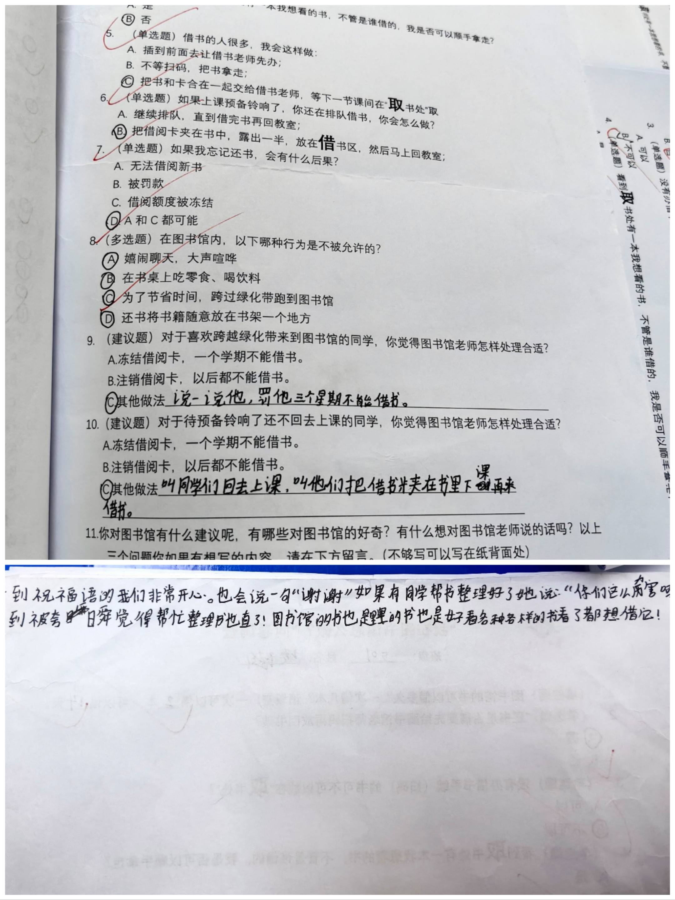 有位四年级男生交了一份非常草率的图书推荐,告诉他这样不行,他便一直强调自己不会写字(但其实也会写字,只是可能书写有困难?),又讲解了一番,还是鼓励他要尝试一下,然后就去帮其他同学办理借还或是收作品,没想到过了一会儿看到他趴在一边哭了起来。赶紧又是安慰又是鼓励,不管作品是否完美,总还是要努力尝试一下。