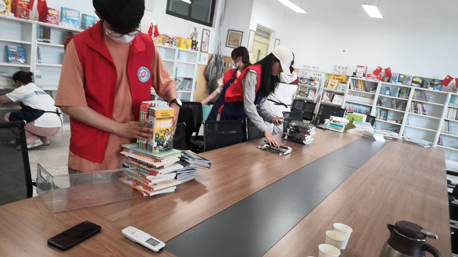 5,三老师探讨怎么让同学爱上阅读。周老师说如果弄个角落,志愿者坐那给孩子讲故事就很好;刘老师精挑了一些不同品类书放桌上,希望进来的孩子能马上看到开始阅读,这样省去挑选的时间…..每个人都在为让孩子爱上阅读尽心尽力,孩子们真幸福。