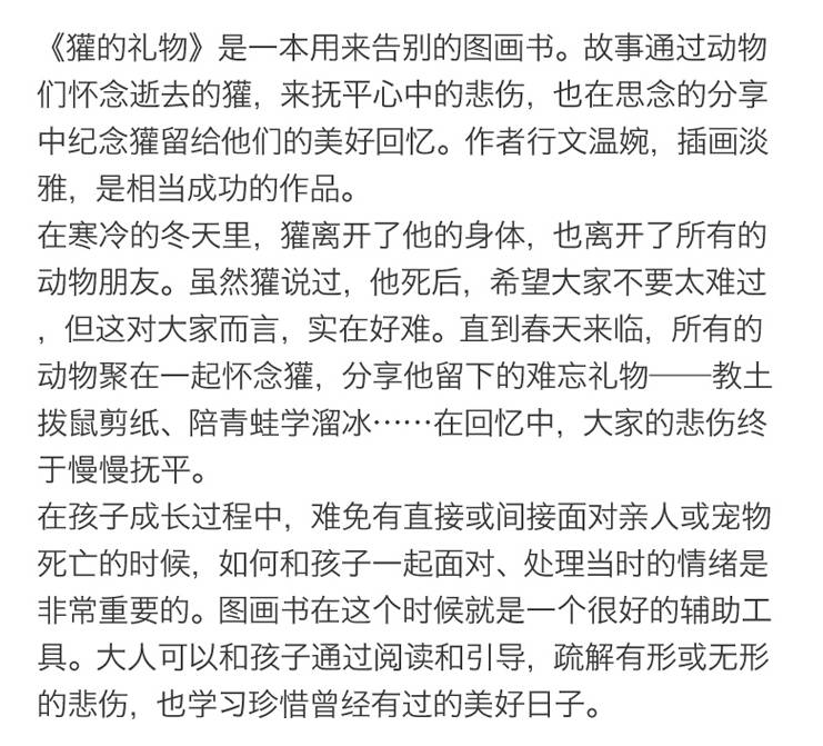 京东内容简介:故事从公园里的一条毛毛虫开始,通过发生在祖孙两人之间的一场生动开放的对话,探讨了生命和死亡的哲学课题。对话涉及了个人对待死亡的态度,比如“你害怕死亡吗?”“临死之前你还想做什么?”也探讨了更深入的哲学问题,比如“为什么我们会死?”“死后会怎样?”等等。面对克里斯钦的提问,爷爷以智慧和幽默的态度予以回应,有时则坦承他其实还不知道问题的答案。在一问一答之中,他们互相分享自己的想法,激荡出更多对生命与死亡的思考,在消化后融合出了一个彼此满足的答案。祖孙俩对话中自然流动的情感、直白单纯的提问、具体易懂的美丽比喻,搭配绘者温暖的图画,让这本书在谈论起死亡时,显得轻柔又平易近人。