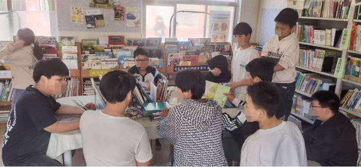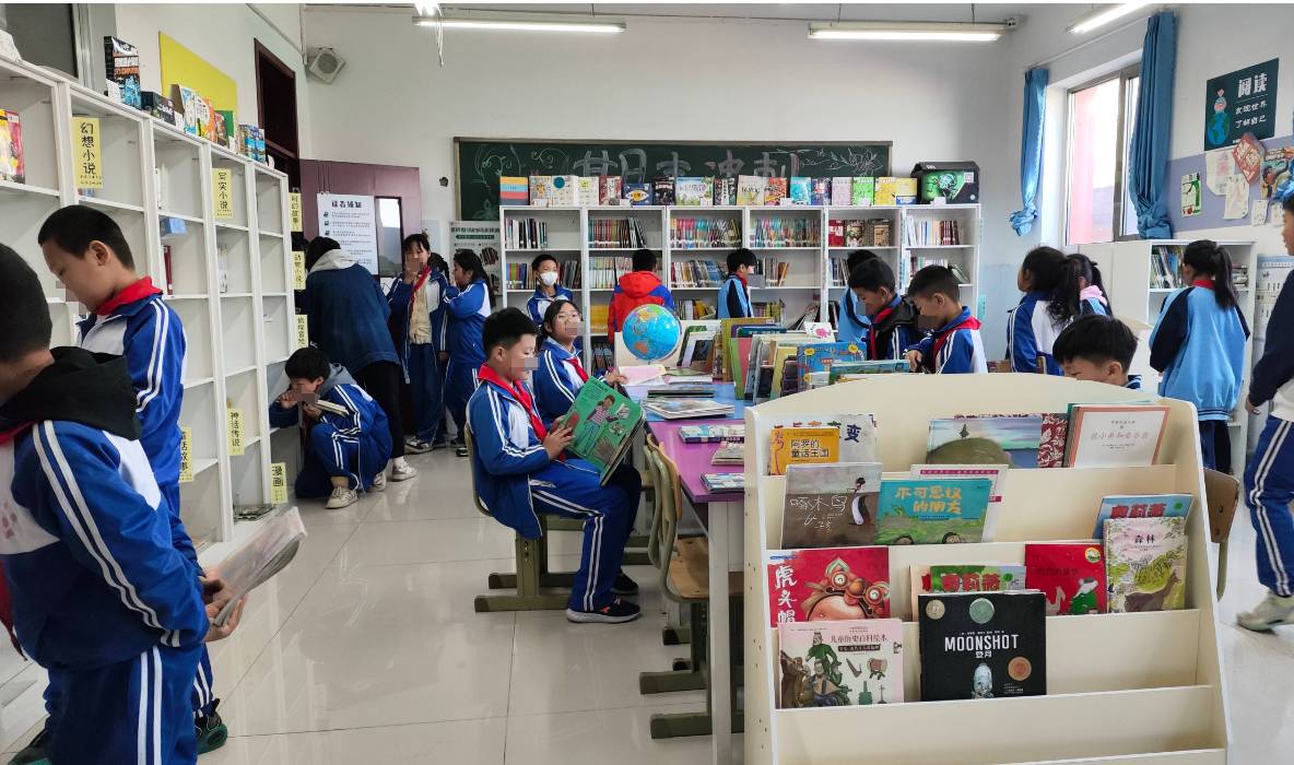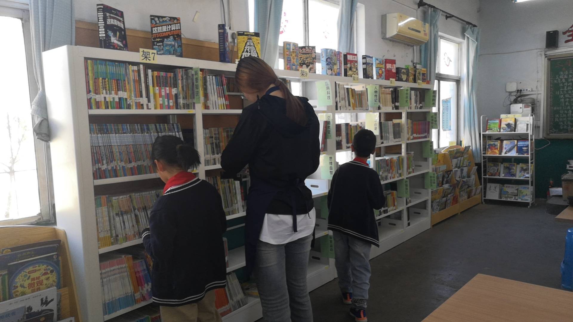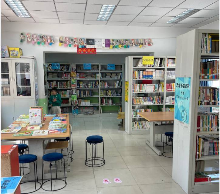 图书馆面积不大但收拾的井井有条,同学们养成了良好的借阅习惯,排队并自己将书籍归架。