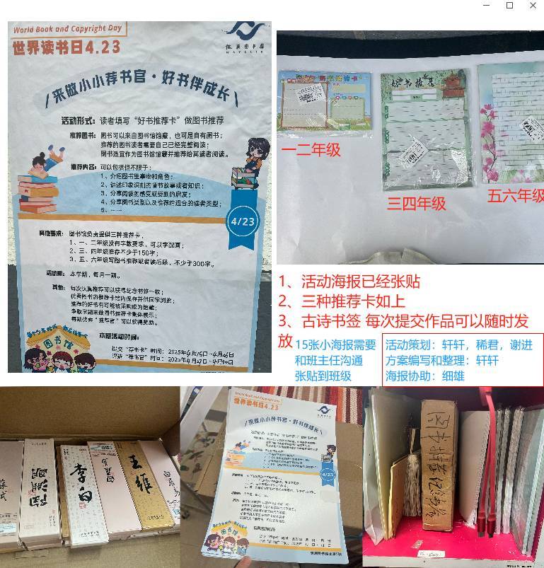1、今天收到了这学期图书推荐官活动的物料【三种推荐纸;一大盒古诗书签,一卷海报(已经张贴一张大的,还有一张备用,如果后续学校允许,也可以放在他们的海报框;还有15张小海报,需要和班主任沟通,张贴到班级)】,馆务会商讨的,还是基于孩子们扎实的阅读,也尽量不给大家日常增加太大的负担。具体如图。