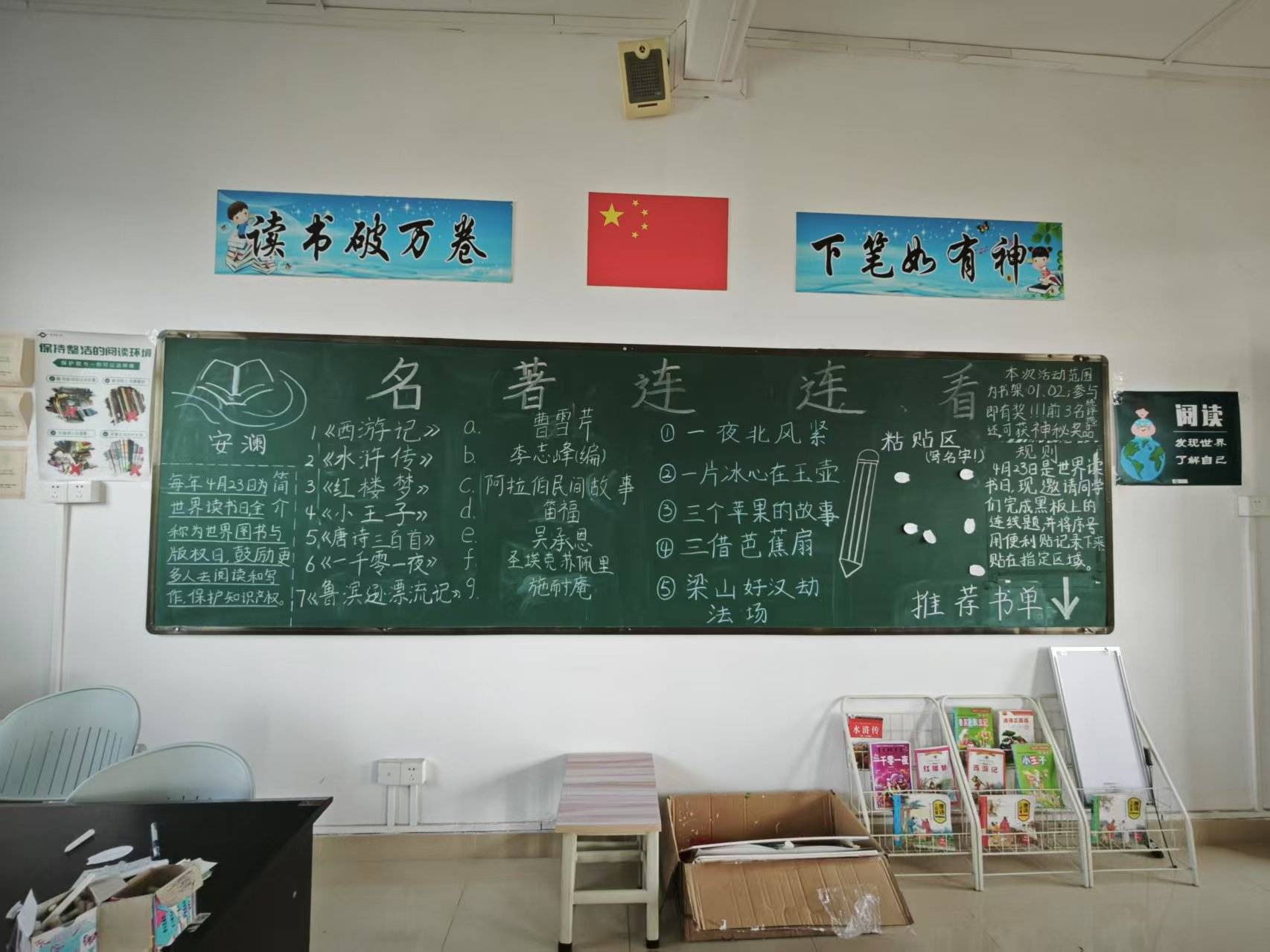 今天图书馆来了特别多小朋友。四月的活动主题是名著连连看,小朋友们都拿着便利贴你一句我一句的连着黑板上的名著题目,不一会黑板就贴满了。