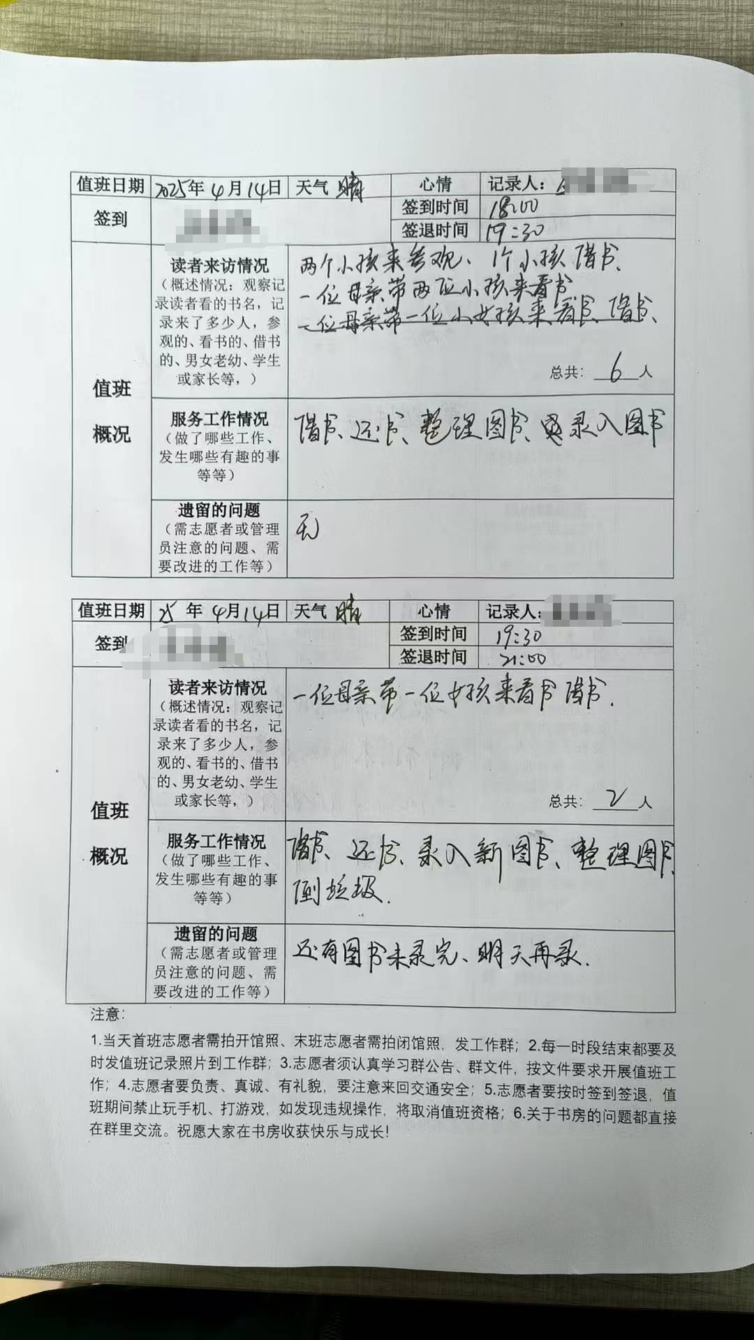这么久了,今天是4馆和校方商定好的开馆的日子,多天孩子们没用借阅卡了,昨天也告知让校方给家长群里说下,星期一上学要补卡的带上补卡费,我一早来到4馆,收拾好卫生,整理好书架,等待校方给我补卡名单,在馆没别的事儿了,就又去5馆值班;5馆上午有两个新志愿者来值班,给他们安排好我才放心。