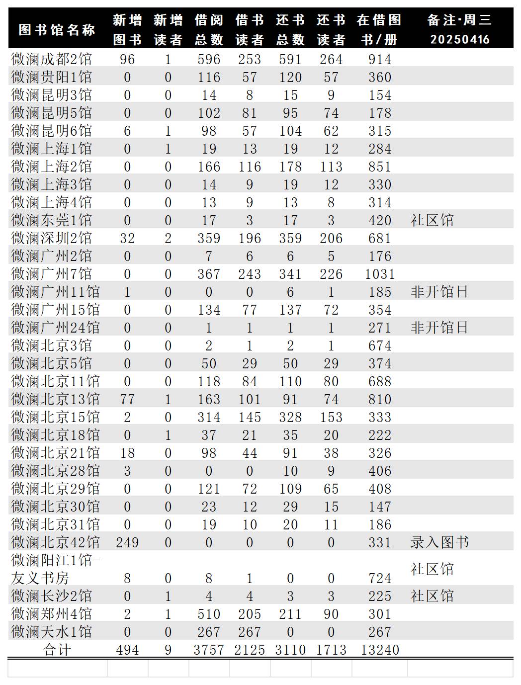 32家图书馆(30家日常开放)为2125位读者借阅图书3757册次,处理归还图书3110册(1713位读者);购买/受捐/学校馆藏等录入上架图书494册,新增读者9位。