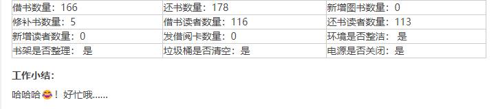 今天是在还书处值班跟2馆另一个馆员一起互助,聊了很多,也向她学习到了很多馆内的新内容。比如补卡登记更新了,比如发卡时有同学没有及时领取的一般放哪里,还有一些生活经验等等。姐姐还夸了我人温柔,感谢姐姐的赞美我收下了,会继续发扬光大的。对了忘记认识你名字了下次遇到一定要记得认识认识,非常感谢姐姐你了。