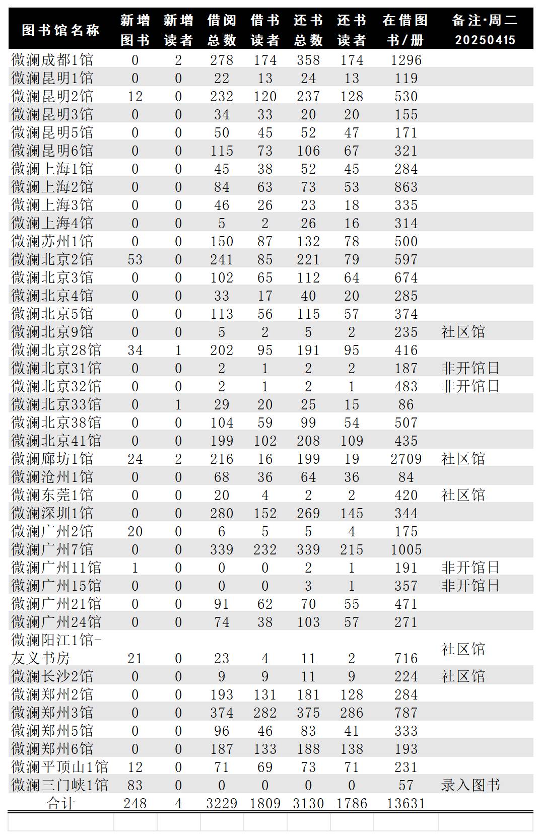 40家图书馆(36家日常开放)为2396位读者借阅图书4140册次,处理归还图书4101册(2367位读者);购买/受捐/学校馆藏等录入上架图书260册,新增读者6位。