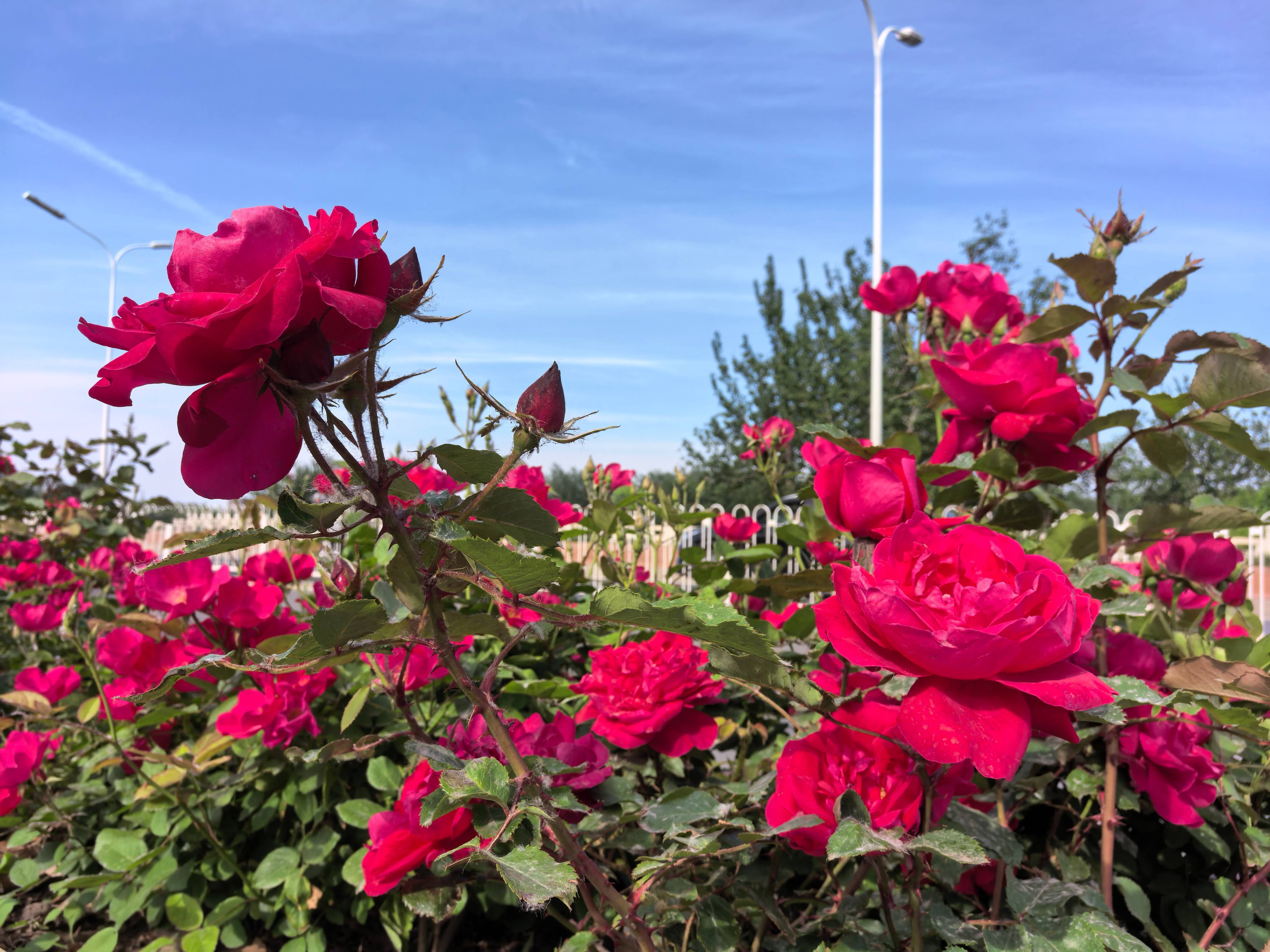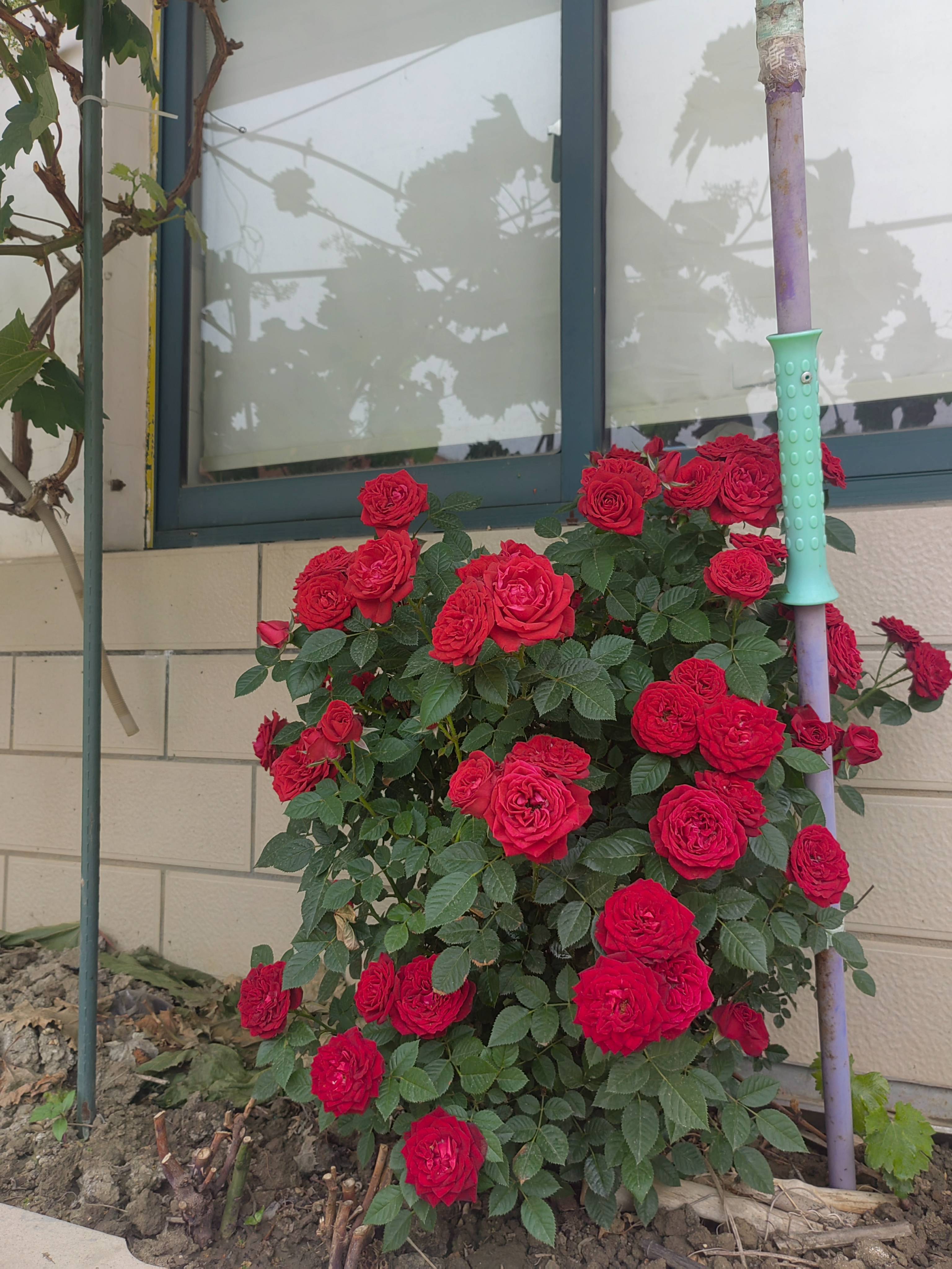 图书室门口的一株火红的月季开得正旺,不同年级的孩子打点着自己班级的植物。