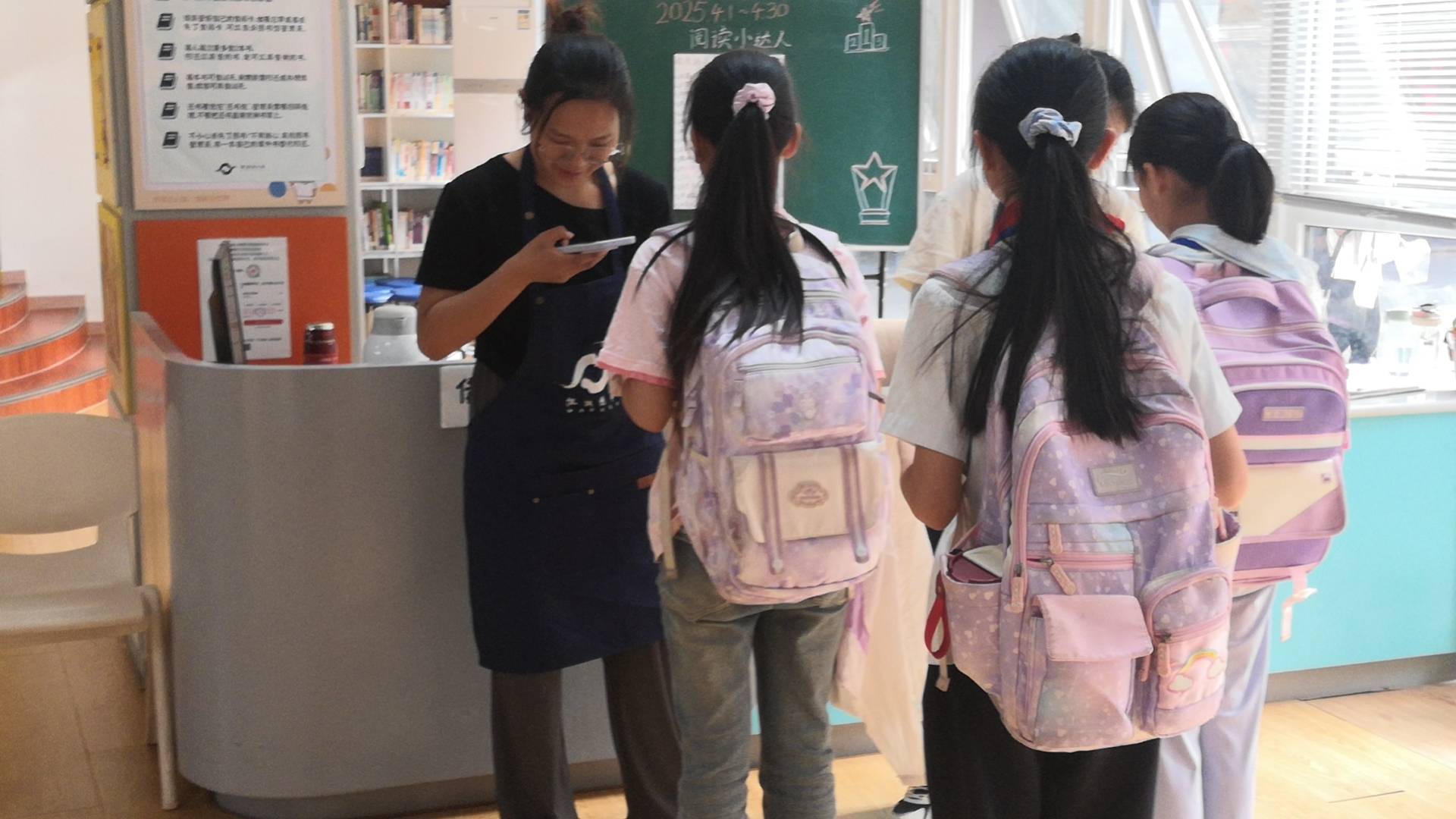3馆的中午总是这样人声鼎沸,川流不息、摩肩接踵,时不时还有打闹、吵架或嬉戏,志愿者需要一边手上操作着借还书,一边用另一只眼时刻盯着他们,谨防出现安全事故。