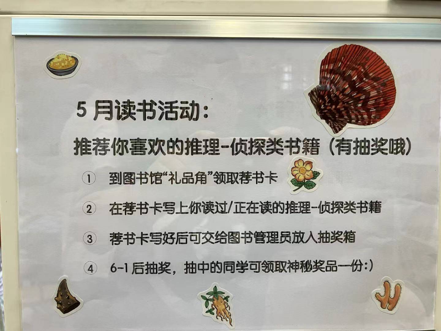 5月读书活动的“宣传海报”已经贴出去了,是“推理-侦探”类书籍的推荐和抽奖,两位华农同学充当推广大使,已经有十几个同学的推荐卡放回抽奖箱了,接下来希望会在同学们之间慢慢传开。