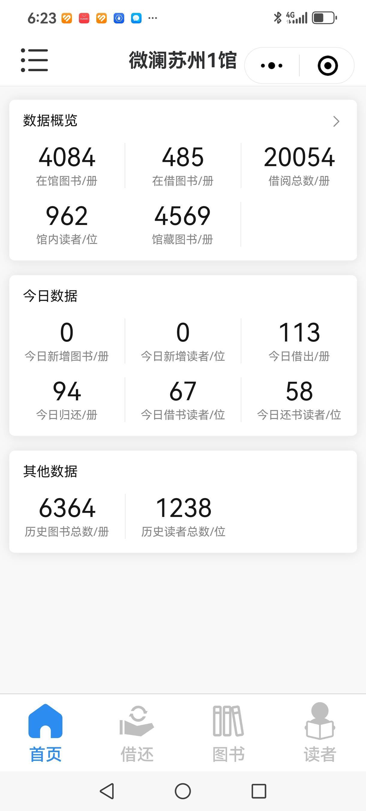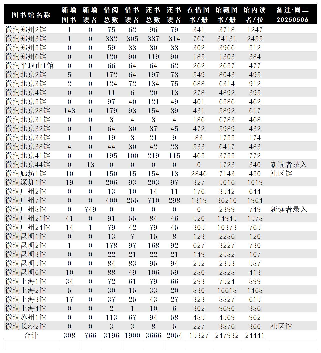 34家馆开放,为1900位读者借阅图书3196册次,处理归还图书3666册(2054人次);购买/受捐/学校馆藏等录入上架图书308册,新增读者766位。