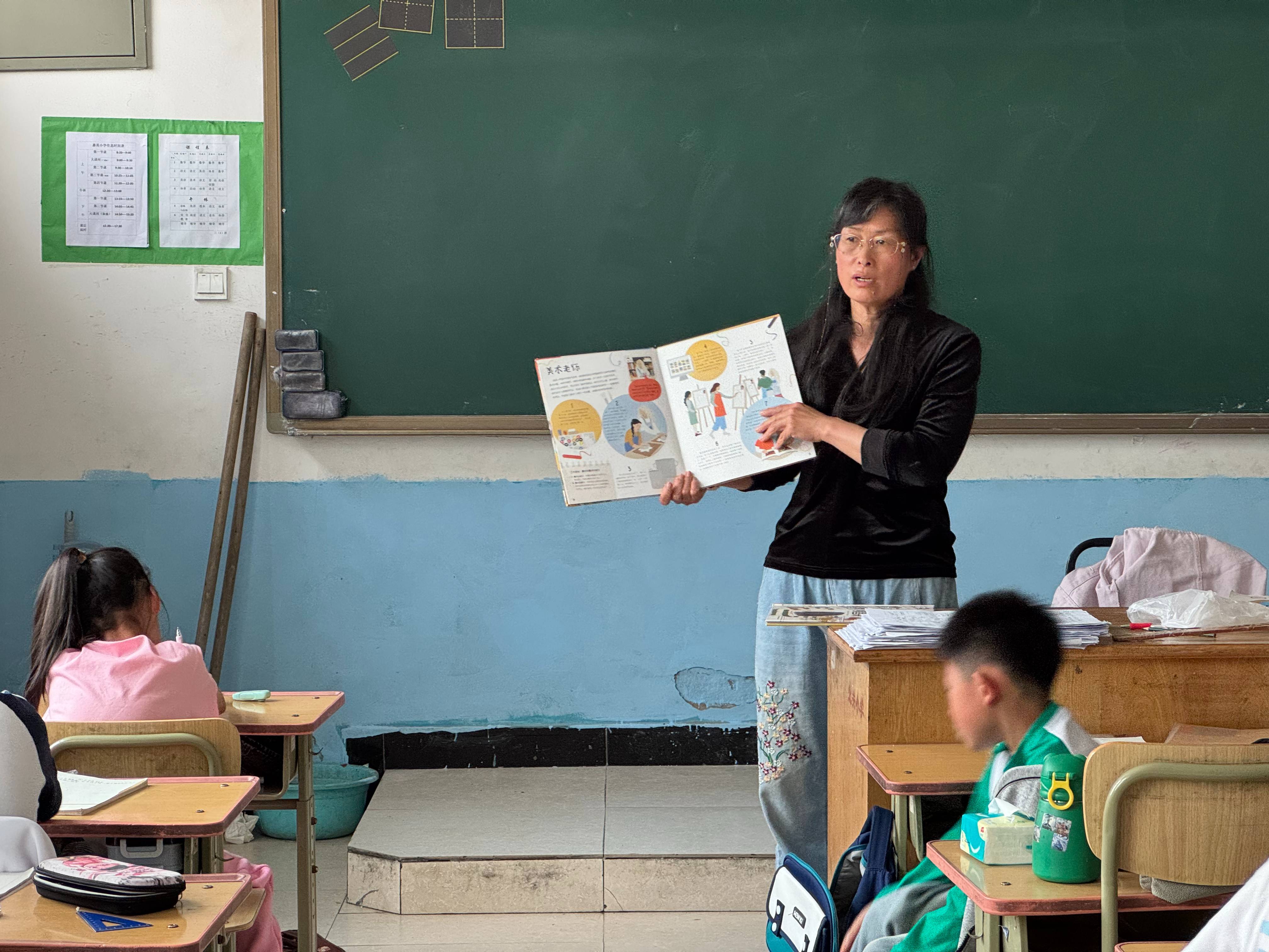下午第一节课,学前班孩子占领了图书馆,李霞把娃娃们领回班上讲故事,适逢学校运动会彩排,教室里喇叭震耳欲聋,难为她了!