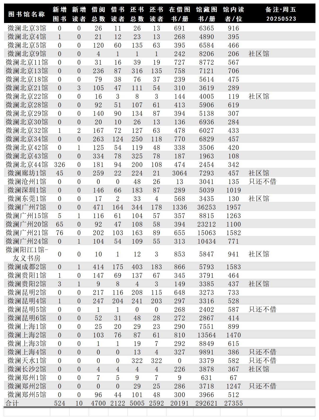 43家馆开放,为2122位读者借阅图书4700册次,处理归还图书5005册(2592人次);购买/受捐/学校馆藏等录入上架图书524册,新增读者10位。