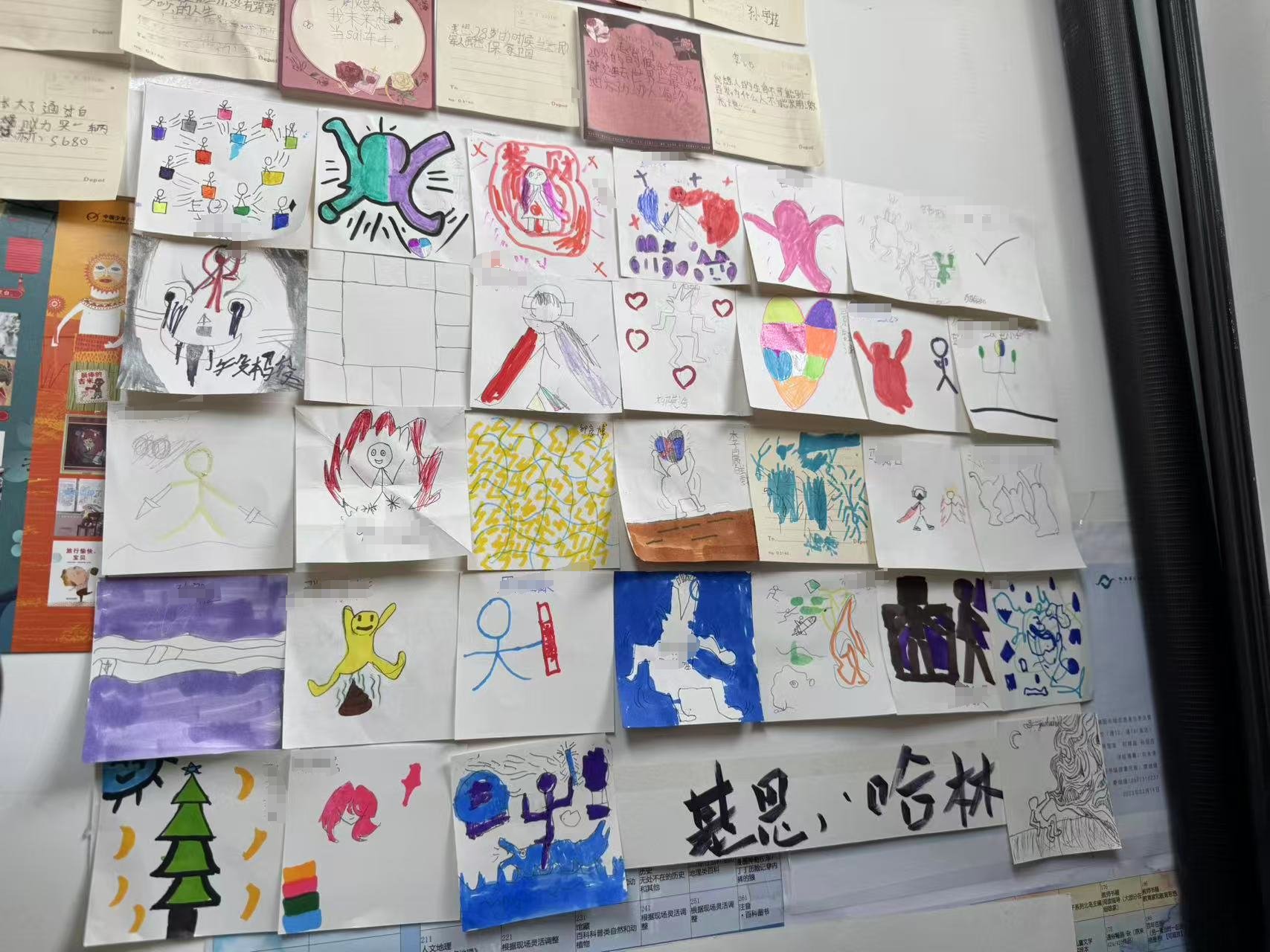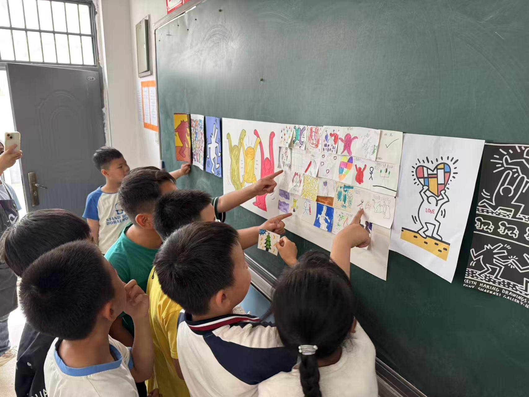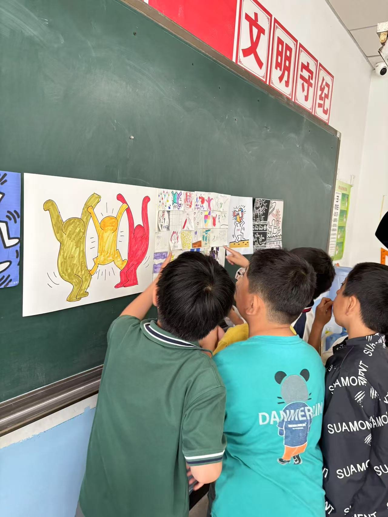 上午和轩轩一起进三2班讲了《基斯哈林》,轩轩为了这个绘本特别准备了好几副基斯哈林的话,还特别设计了课堂上的绘画环节,鼓励孩子们像基斯哈林一样自由绘画。孩子们参与热情很高涨,不一会轩轩准备的展示墙就贴满了孩子们的画。中午,我站在绘画墙前欣赏孩子的画,就像绘本里所说的,没有高低评价,每一幅都是孩子们个性的展现,都有其独特的魅力。