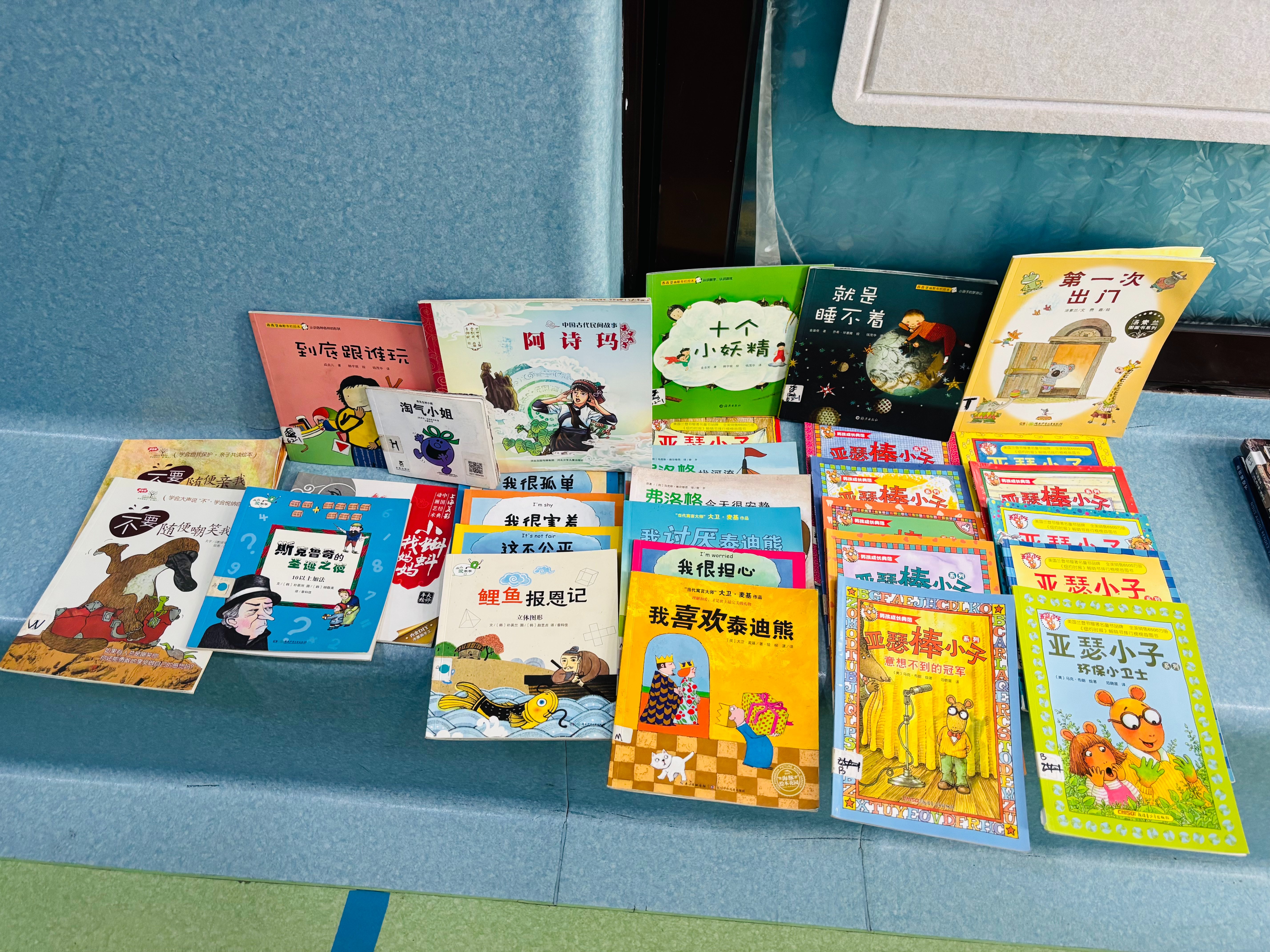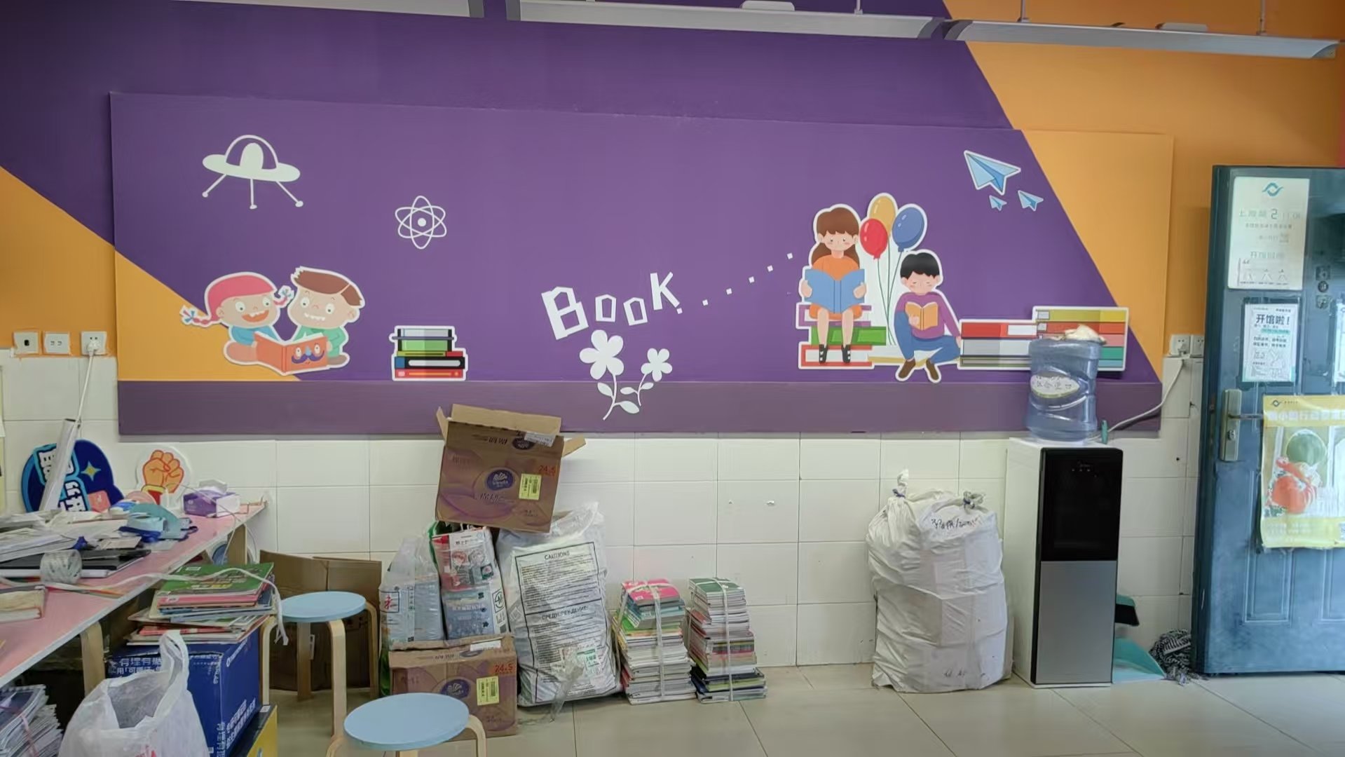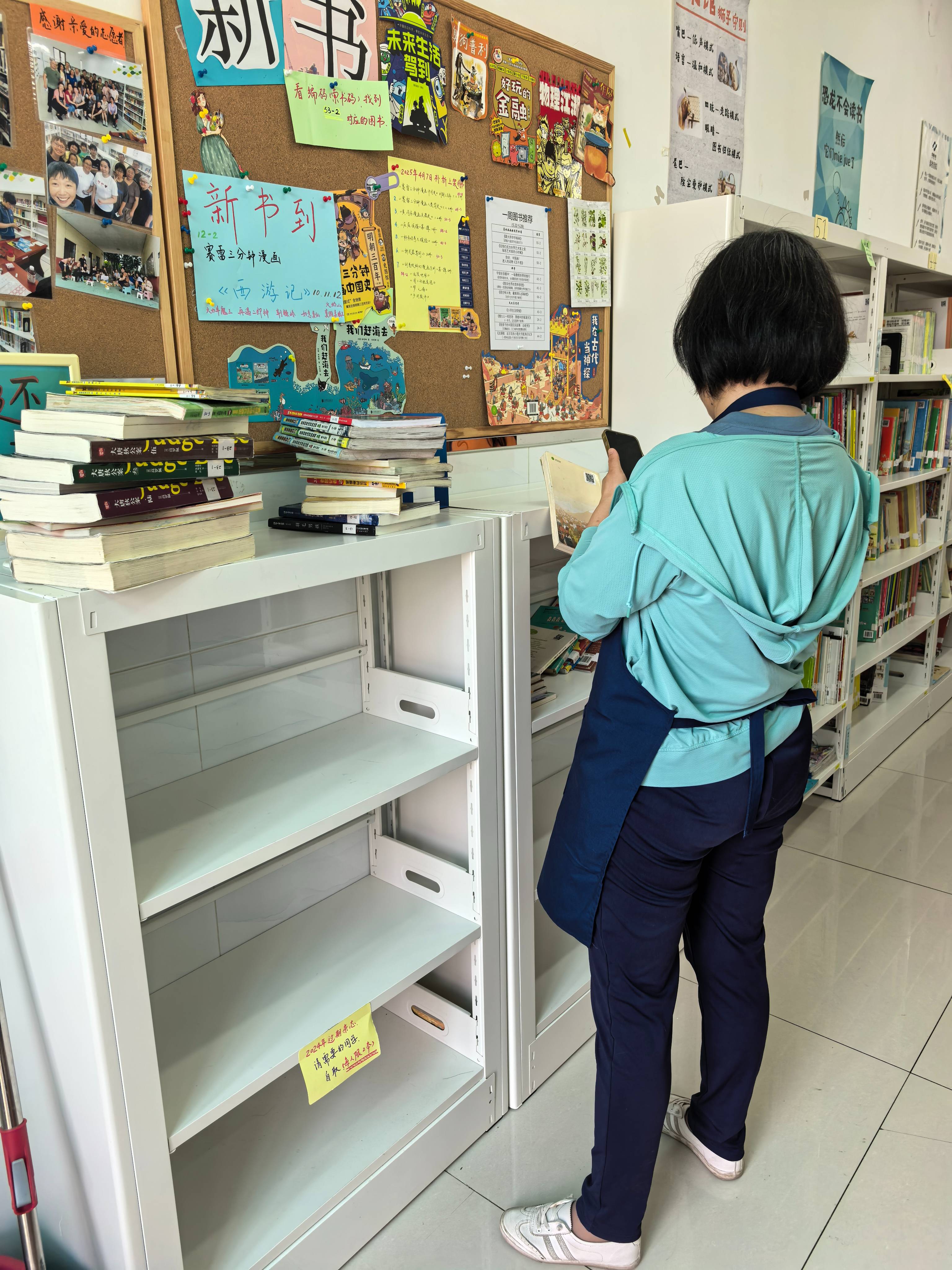 然后她们又把打算发给六年级毕业生的纪念书籍从馆里下架然后整理出来摆在桌上以便孩子们挑选。