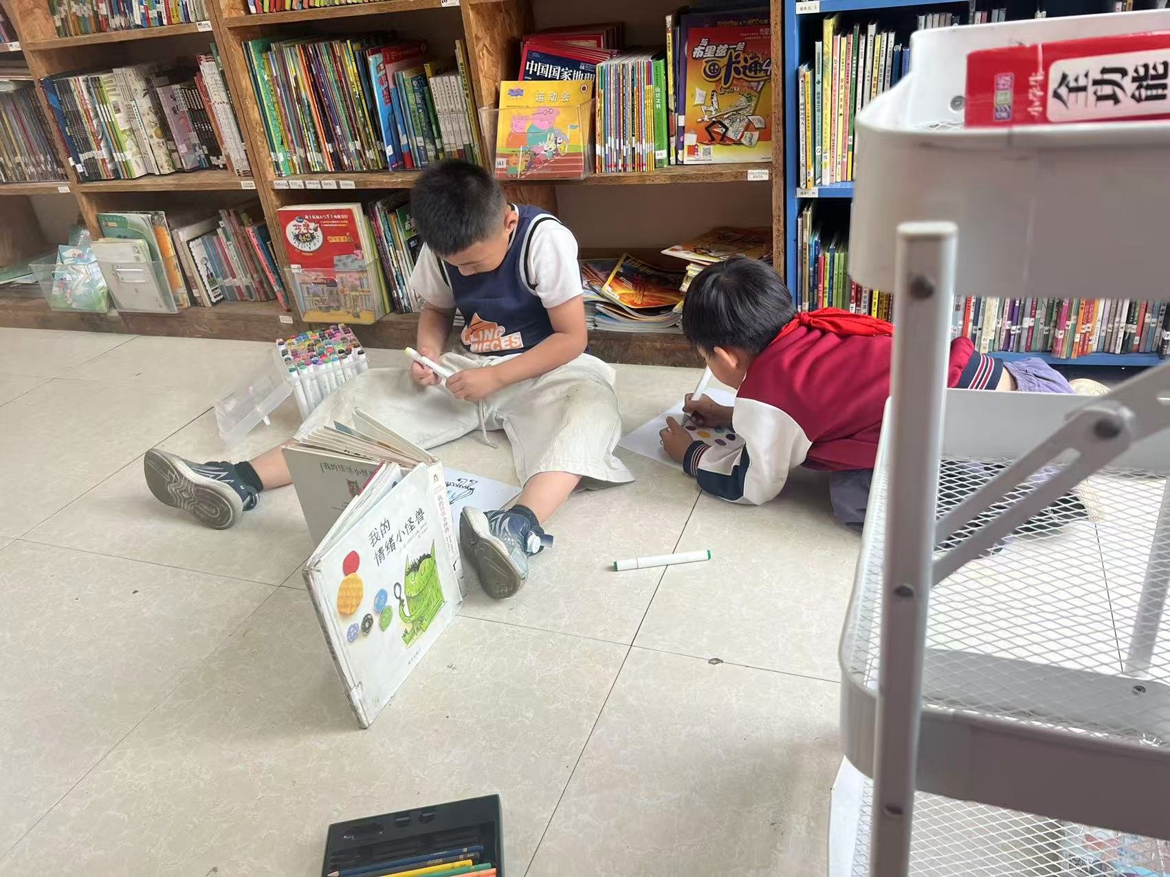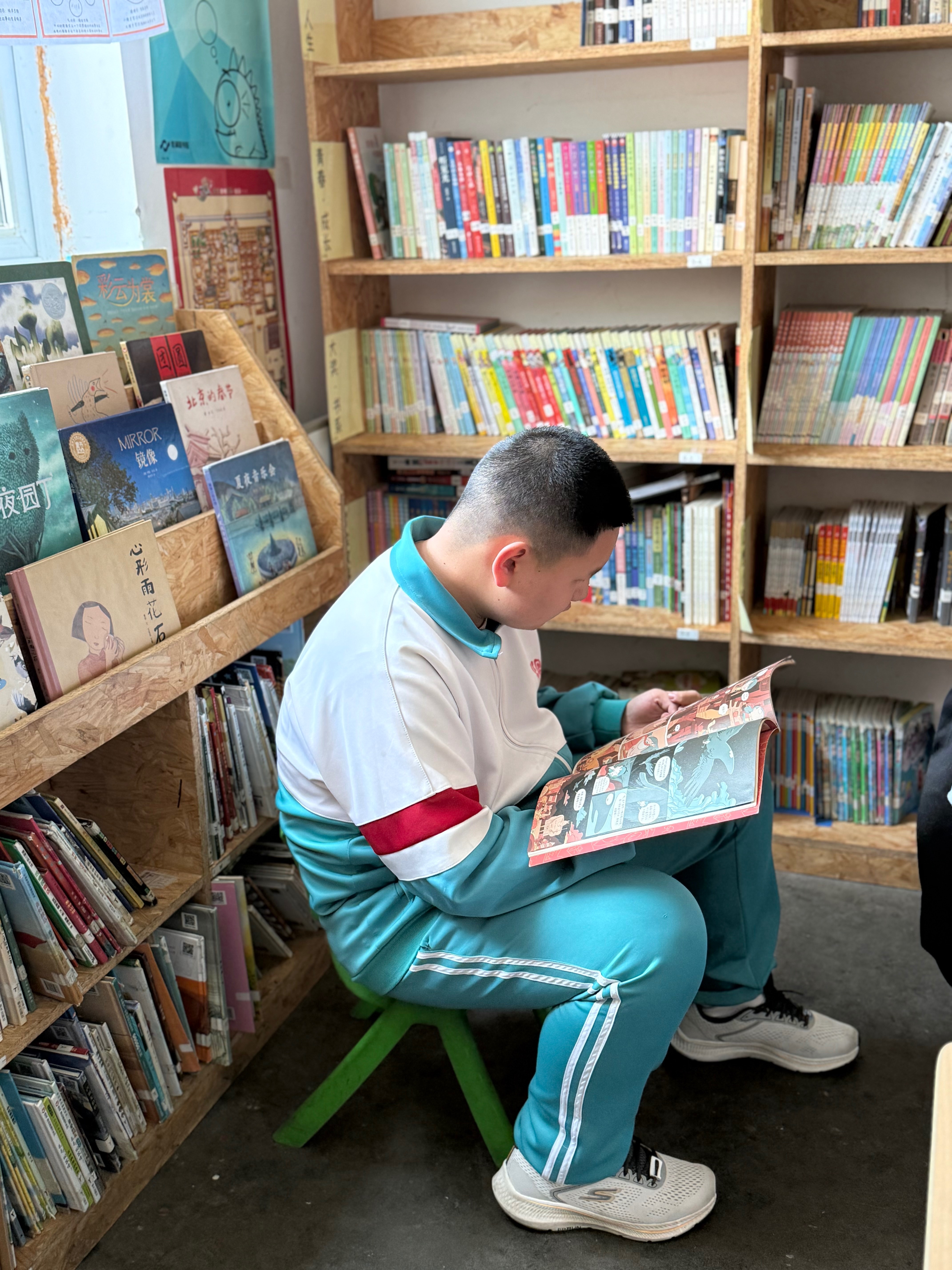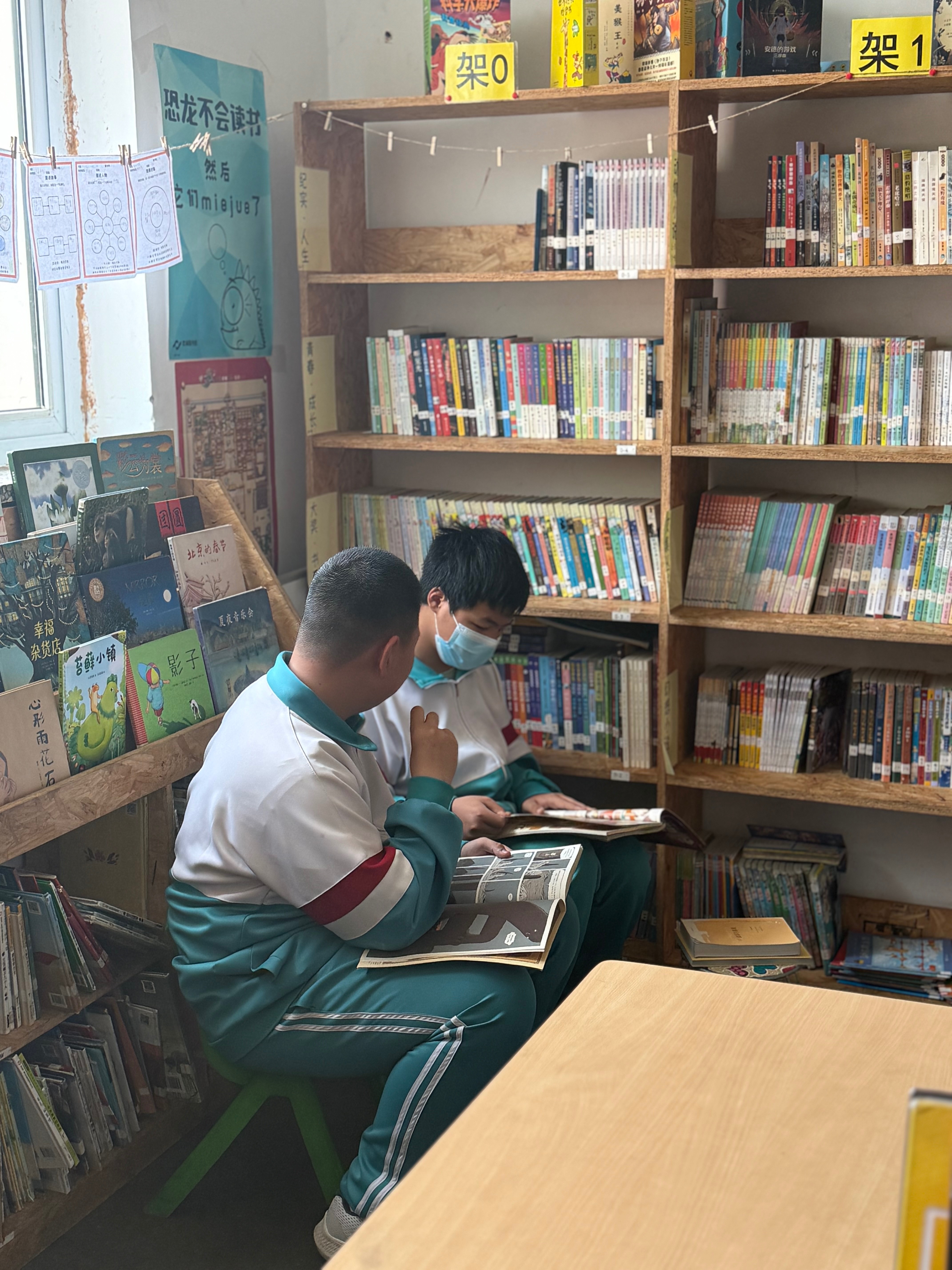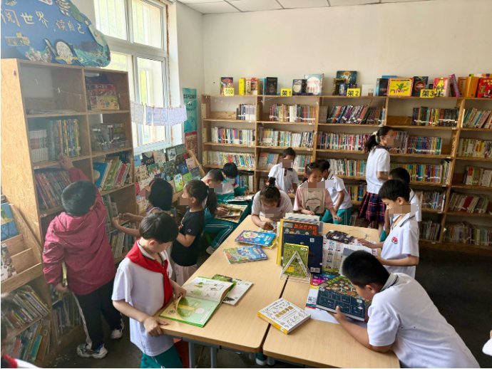 下课后孩子们来到图书馆还书,并挑一本馆里准备好的旧书留作纪念,孩子们很开心。