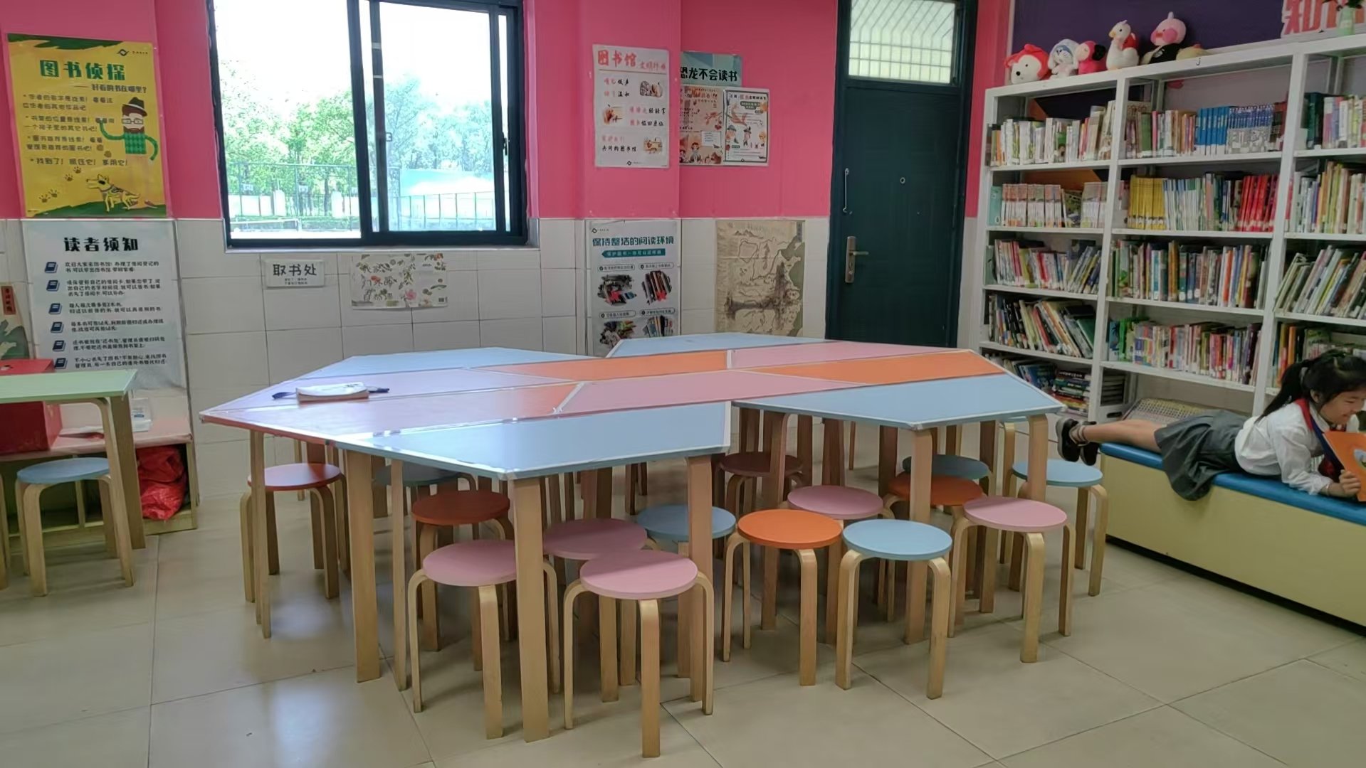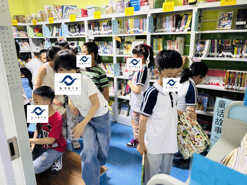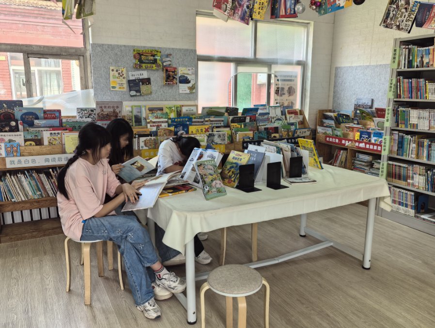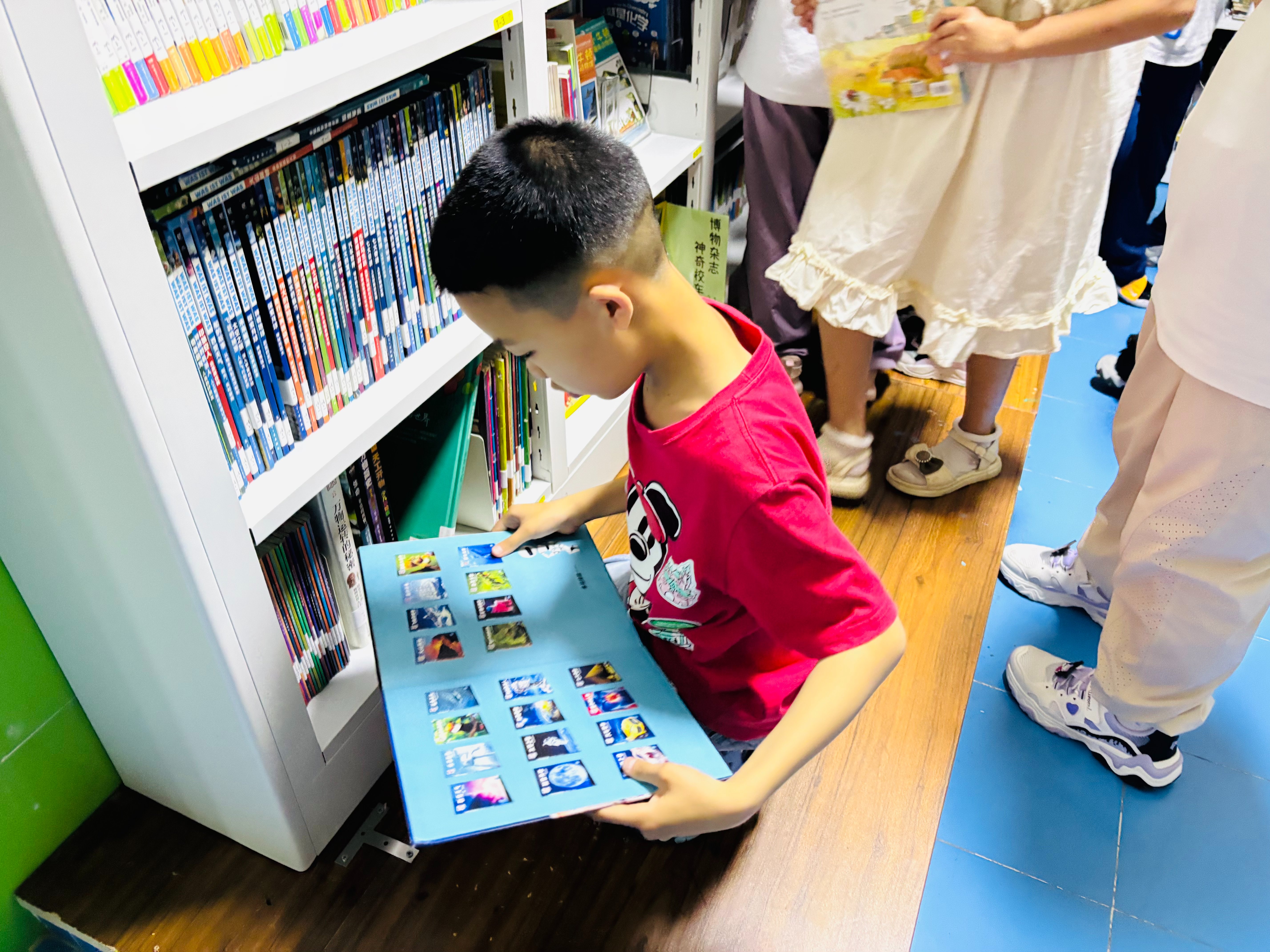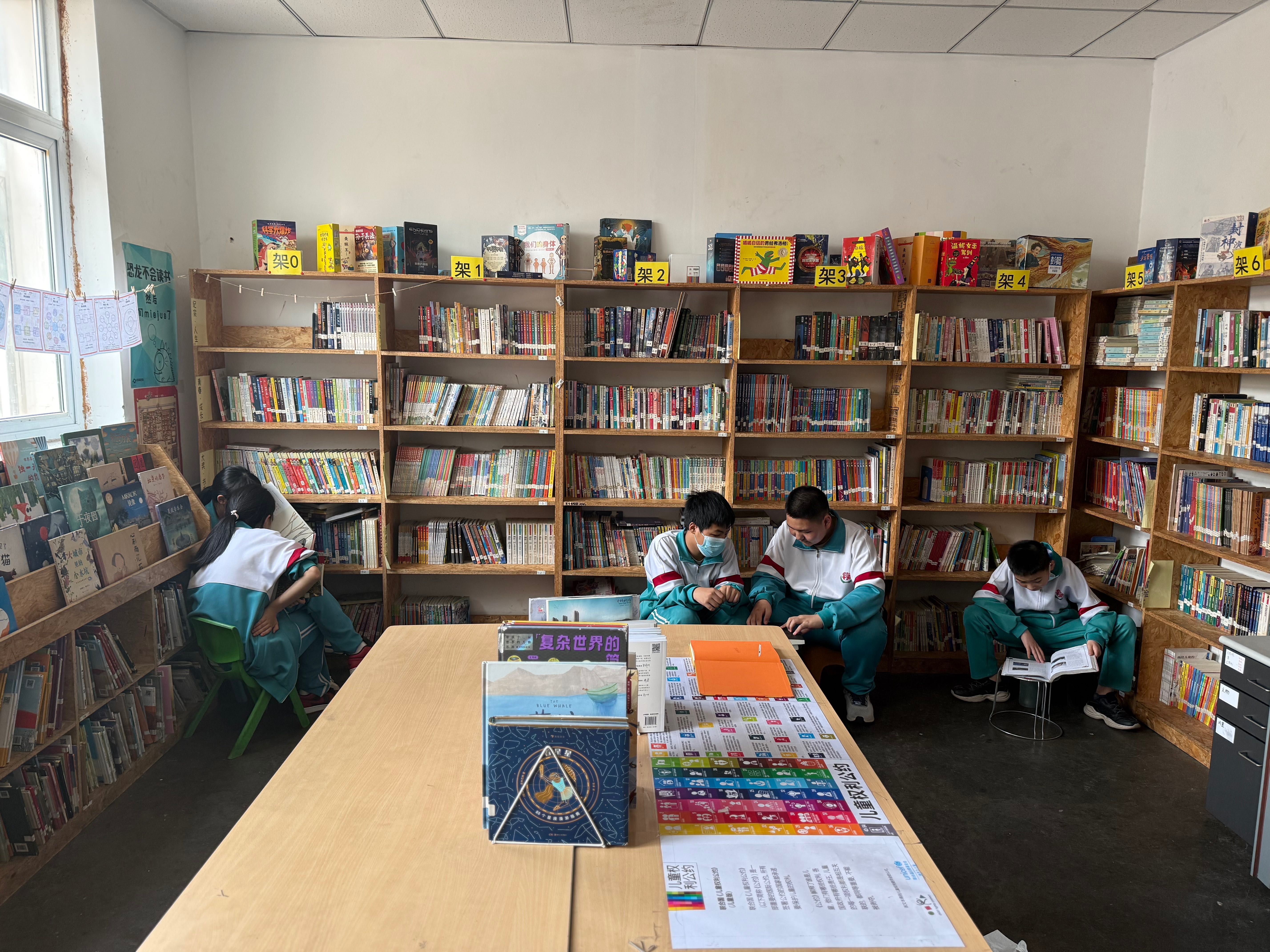 下课后孩子们来到图书馆还书,并挑一本馆里准备好的旧书留作纪念,孩子们很开心。