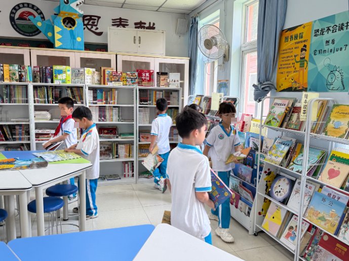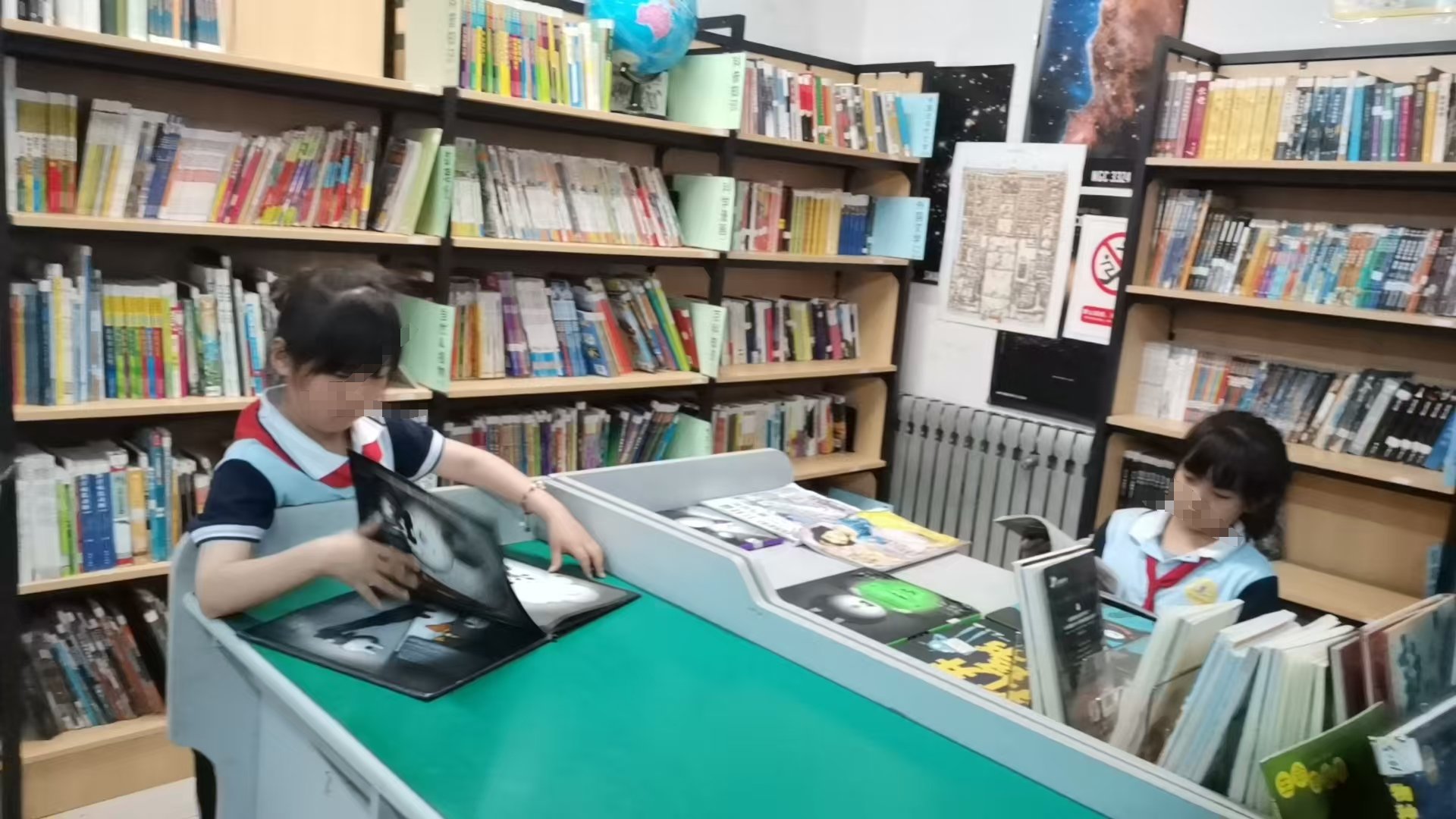 课间的时候,六年级的孩子们来挑选心仪的图书,对于能够拿走图书馆里的一本书不用再还了,还是很兴奋的!