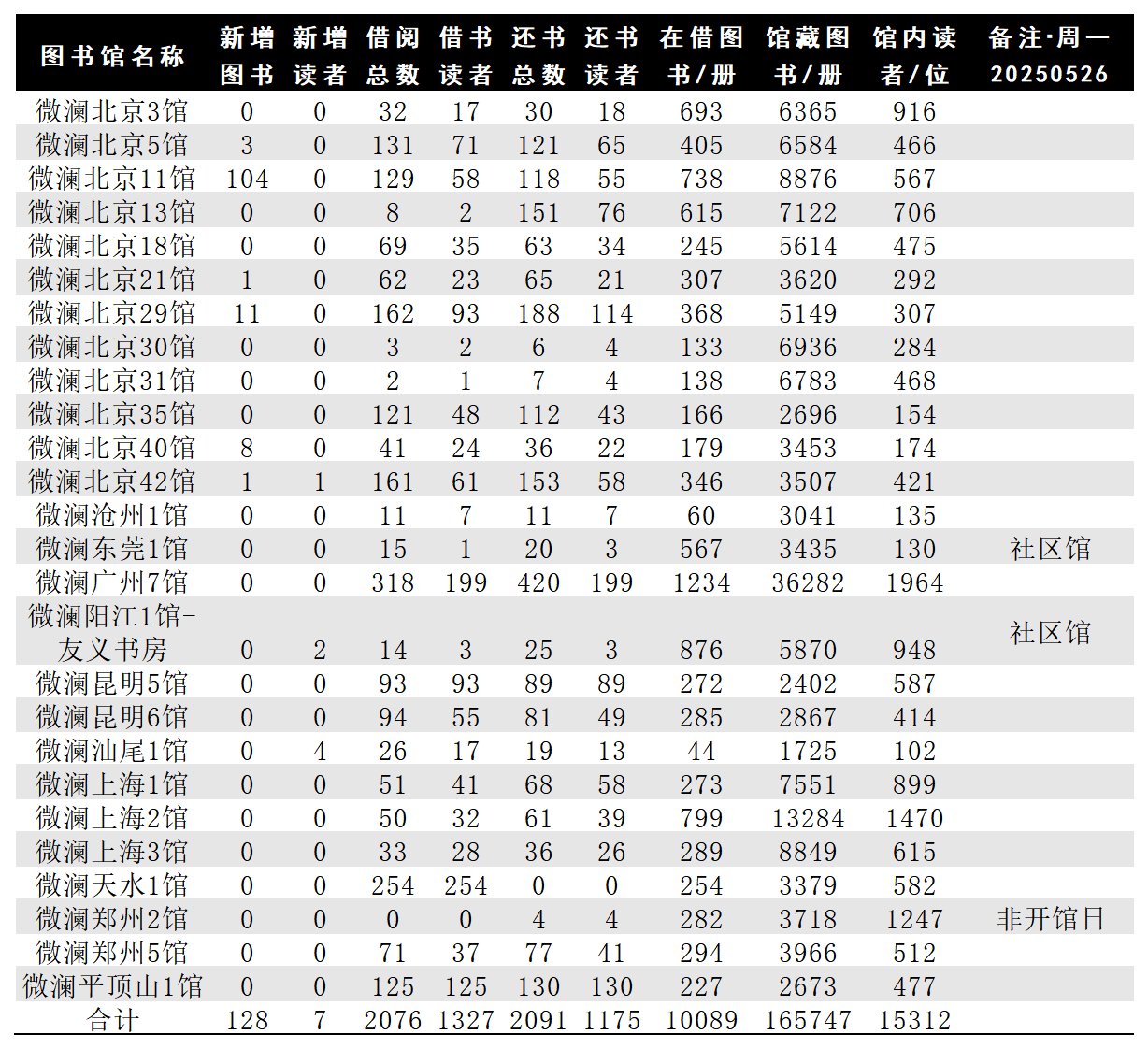 25家馆开放,为1327位读者借阅图书2076册次,处理归还图书2091册(1175人次);购买/受捐/学校馆藏等录入上架图书128册,新增读者7位。