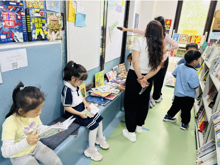 二年级1班今天借书时间先到操场拍读书照片再来馆里借阅书的,其他班也有来馆里拍图书馆日常的照片、视频,说最近有家长会。