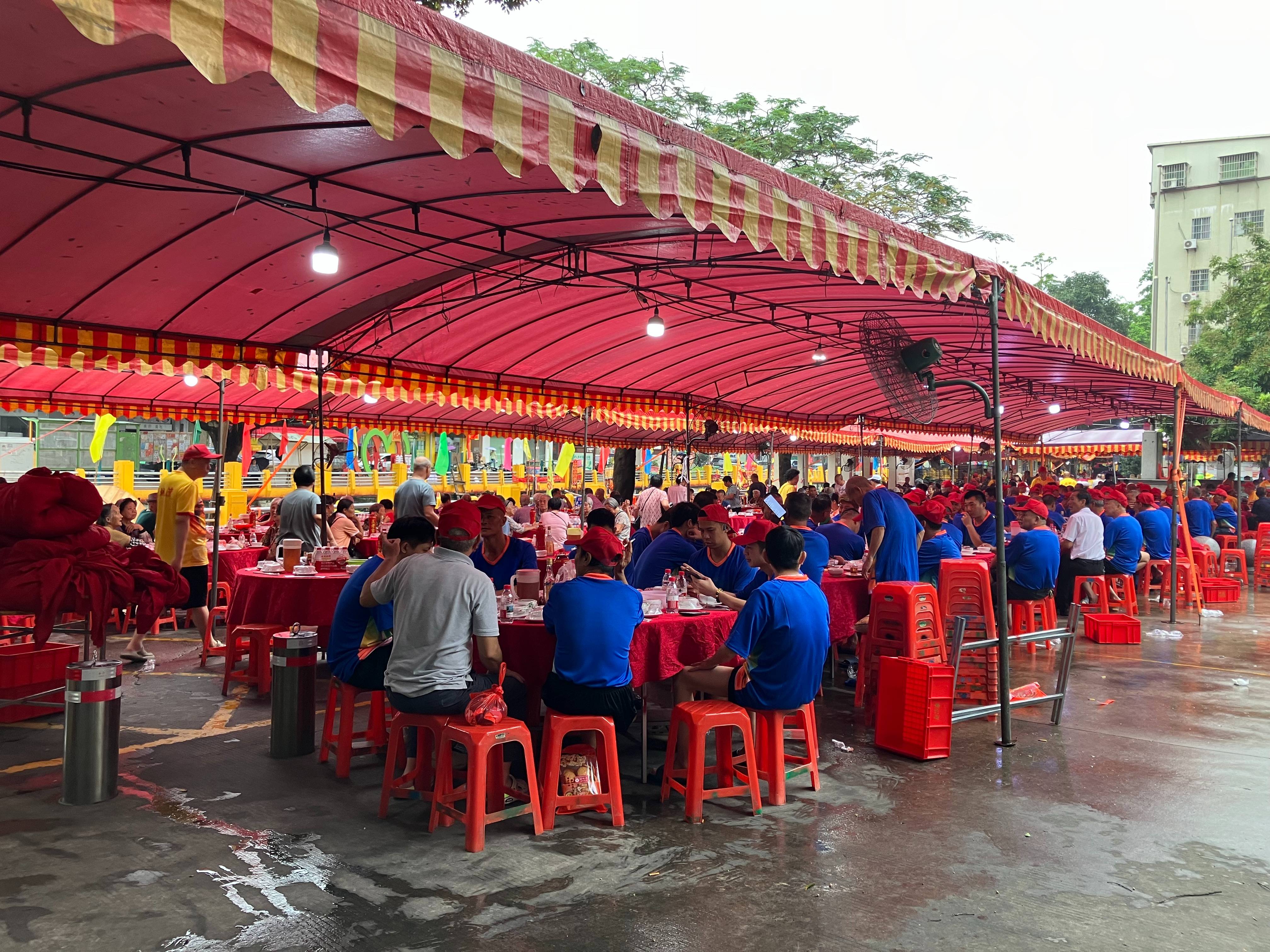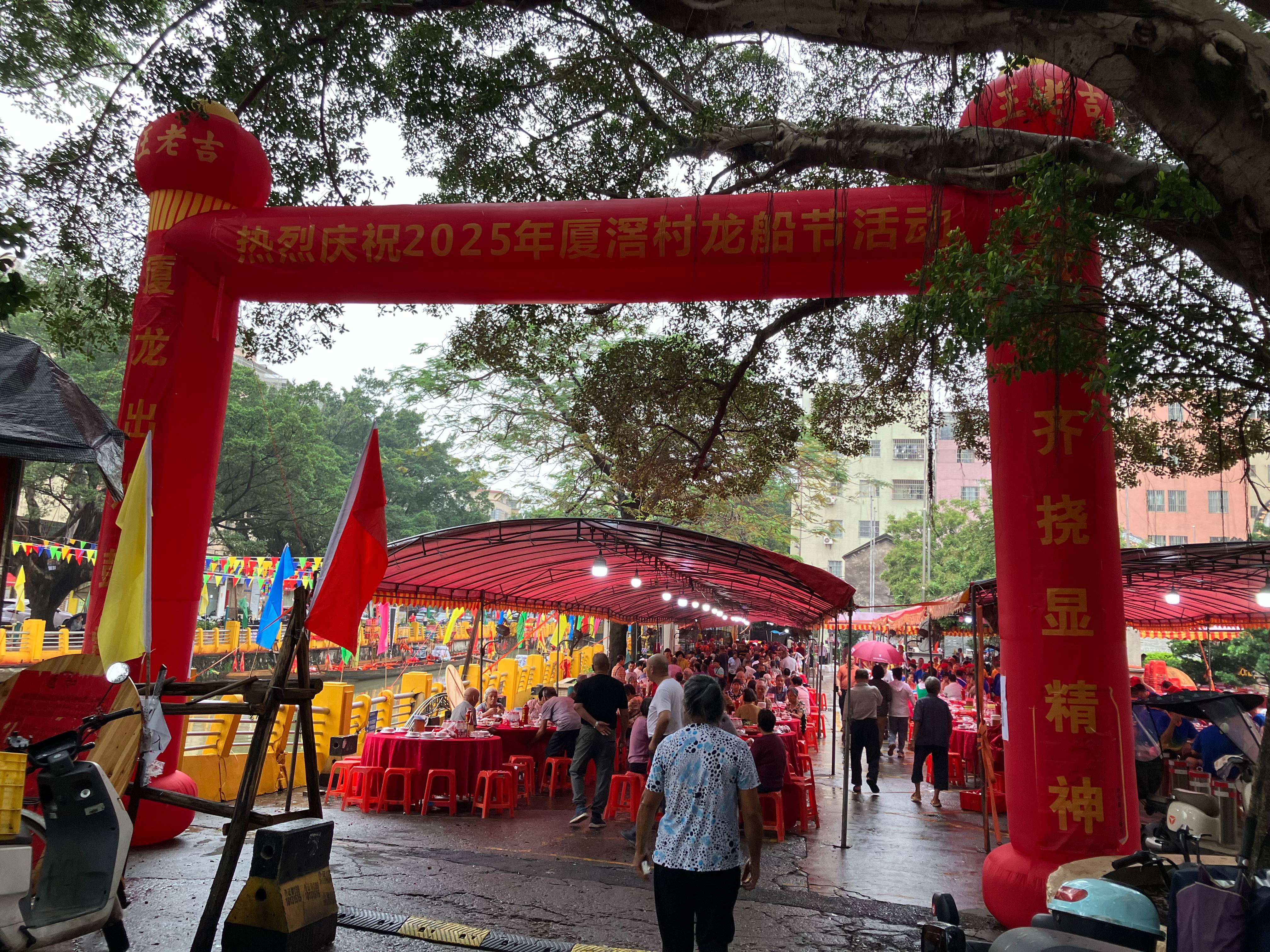 昨晚的瓢泼大雨挨到今日,出门时只有淅淅沥沥的小雨了。出了地铁站走到进厦滘村的桥上时,发现地上散落了很多的鞭炮纸屑,心想这里不🈲️烟花炮竹么?到底是哪样的喜事搞得这么大的阵仗?过了桥往左一拐,就看到大大的横幅“热烈庆祝2025厦滘村龙船节活动”,沿着河岸摆了长长的宴席,还蛮壮观的。还是这种传统的村落民俗保持的好啊——最近在看汪曾祺和林海音,恍惚间又似体味到了某种年代感和闲情逸趣。