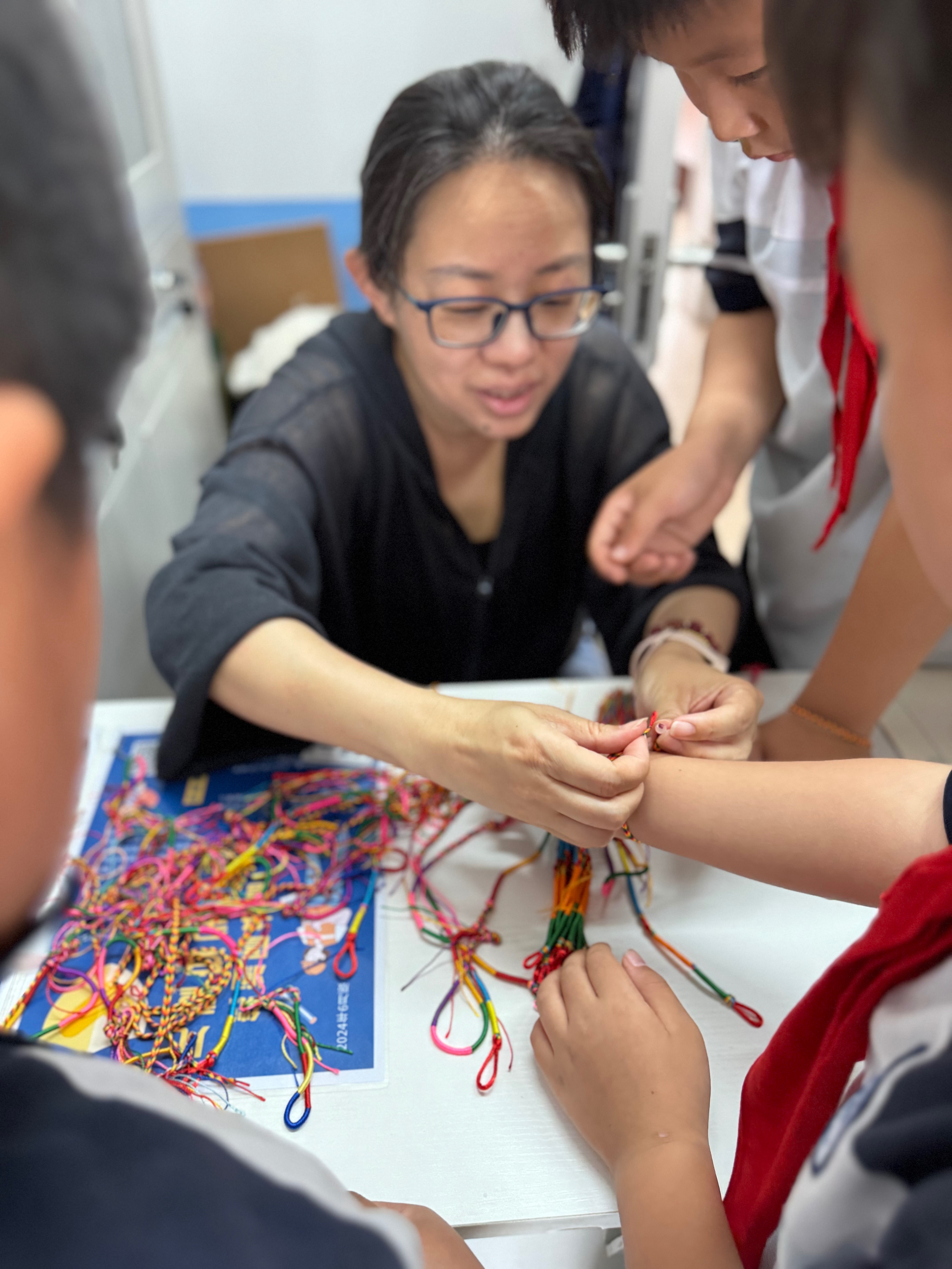 馆长带来端午礼物,为同学们带上一条五彩绳,以宣传中国的传统文化。