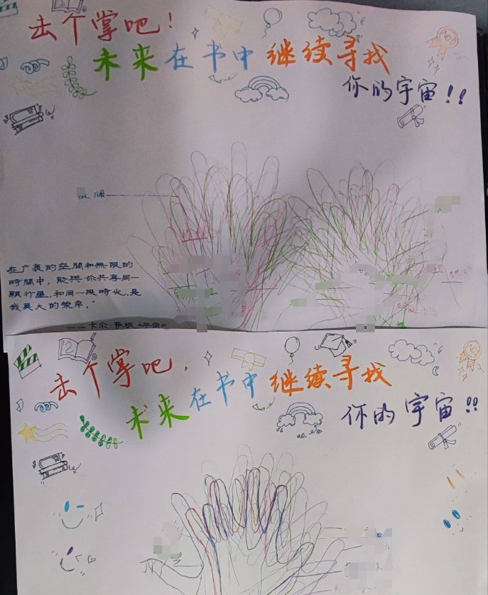 今日学校组织各班级月考,孩子们来馆借书还书的人不是很多,中午去六年级两个毕业班一趟完成“击个掌”的海报任务,六(1)班的读者很有秩序地每个人画下了自己的掌印并签上了自己的名字另外有两个同学没来;六(2)班午休老师让同学们改试卷没去打扰这学习的氛围……九年级的部分学生在馆里聊了自己毕业的规划,有的想学机电一体化专业,学成之后可以为家里维修电器;有美术根基的同学报了雕刻的专业,还有的听父母安排学习,总之只要有目标就会有好得发展方向,希望同学们都能把学校老师教的专业知识用到生活实践中,为社会为家庭为自己憧憬美好的未来。