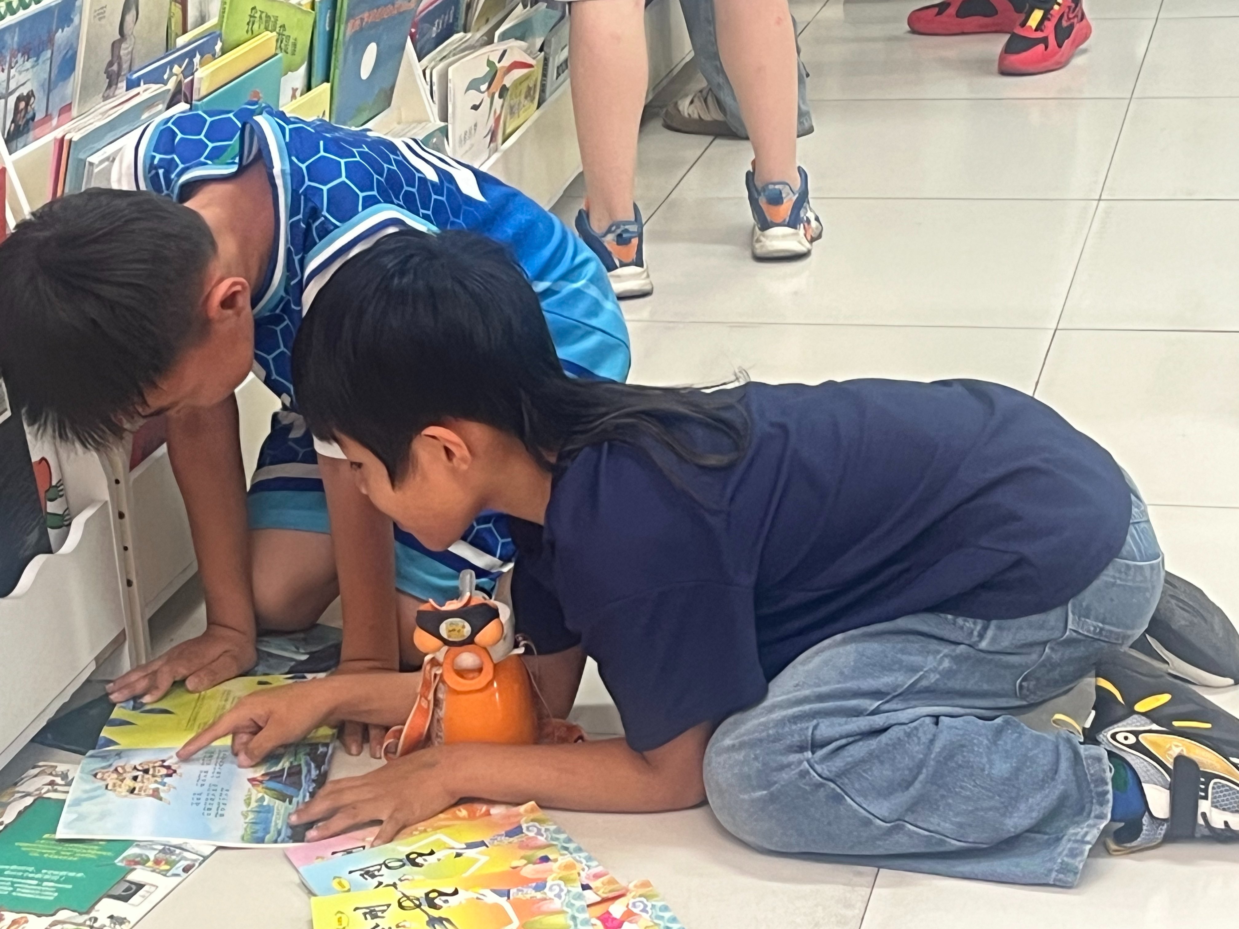 孩子们挑选着自己喜爱的书籍,哪吒的彩绘本被一群孩子簇拥着。