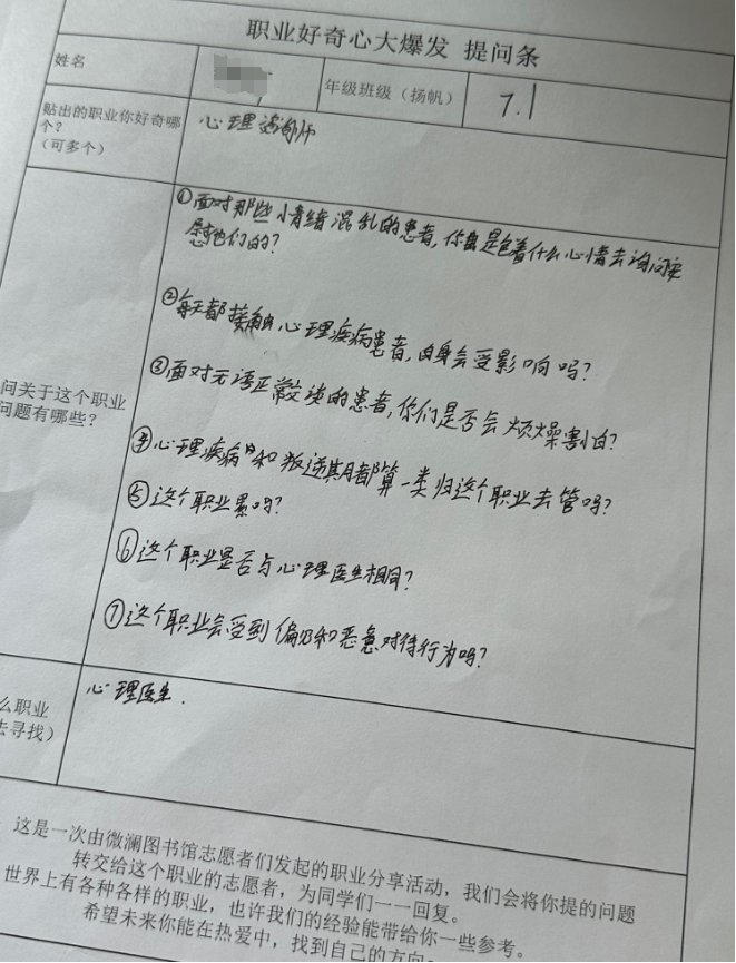 有个女生对心理咨询师职业提出六个问题,足见她的深度思考与浓厚兴趣。交流过程中,她不仅对该职业有了新认知,对“抑郁症”和“负面情绪”也有了更清晰的理解 。