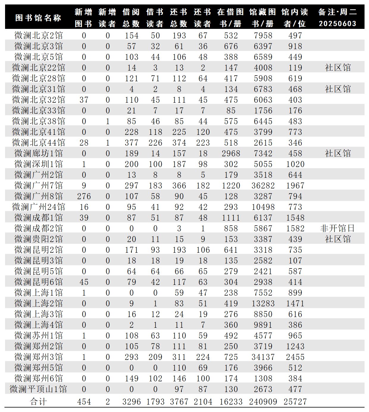 33家馆开放,为1793位读者借阅图书3296册次,处理归还图书3767册(2104人次);购买/受捐/学校馆藏等录入上架图书454册,新增读者2位。