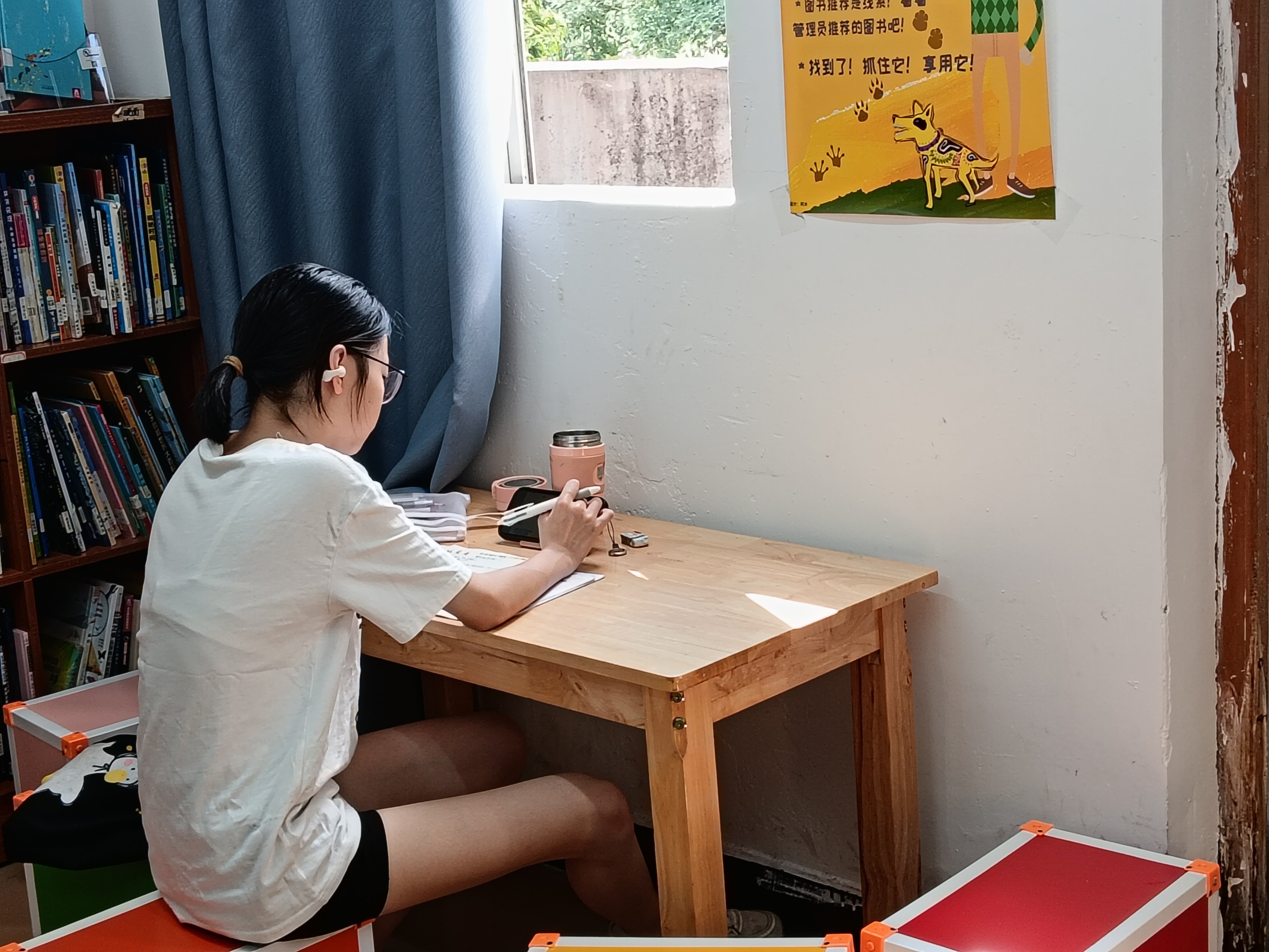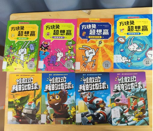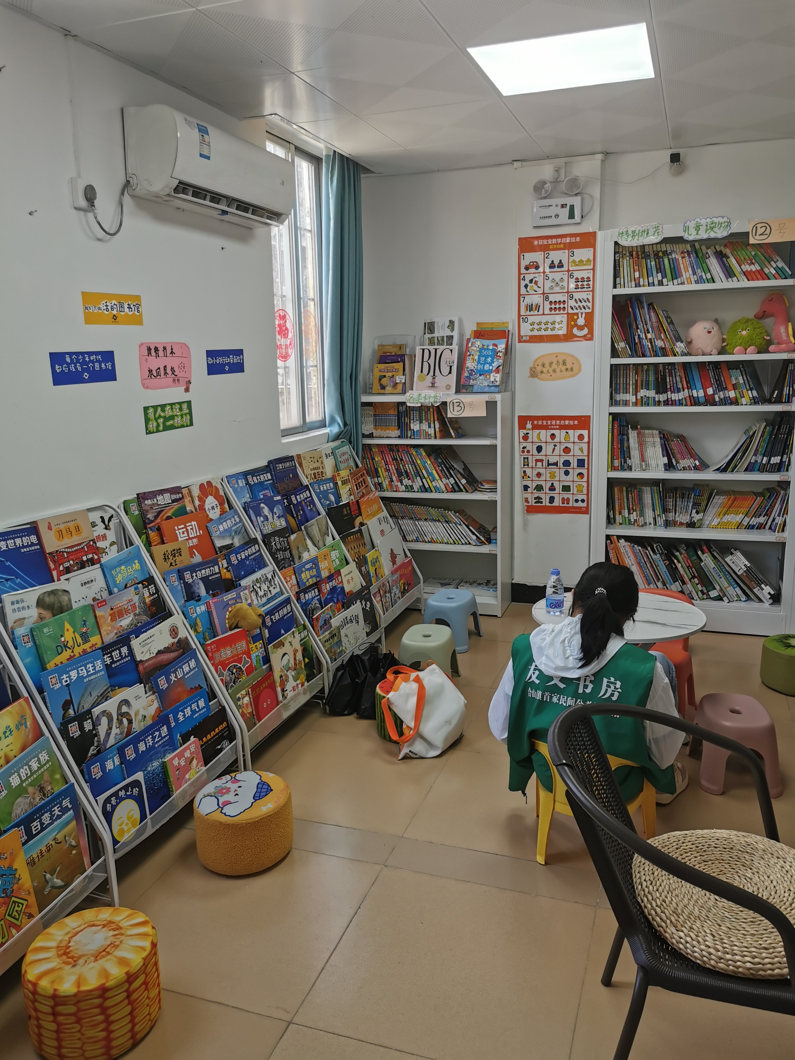 hx跑在前面开门,孩子们进来,放定书,就去找书看了,今天太热,没有开窗,两个空调开(离开前关了),两边灯开,hx帮忙拆箱,我拍照,她贴签,我录入,为了信息准确,以及顺手分类和写新书速递,后面我负责新书,hx负责借还。倒没有很忙碌。很快乔阿姨和雨辰,猴宝也来啦。