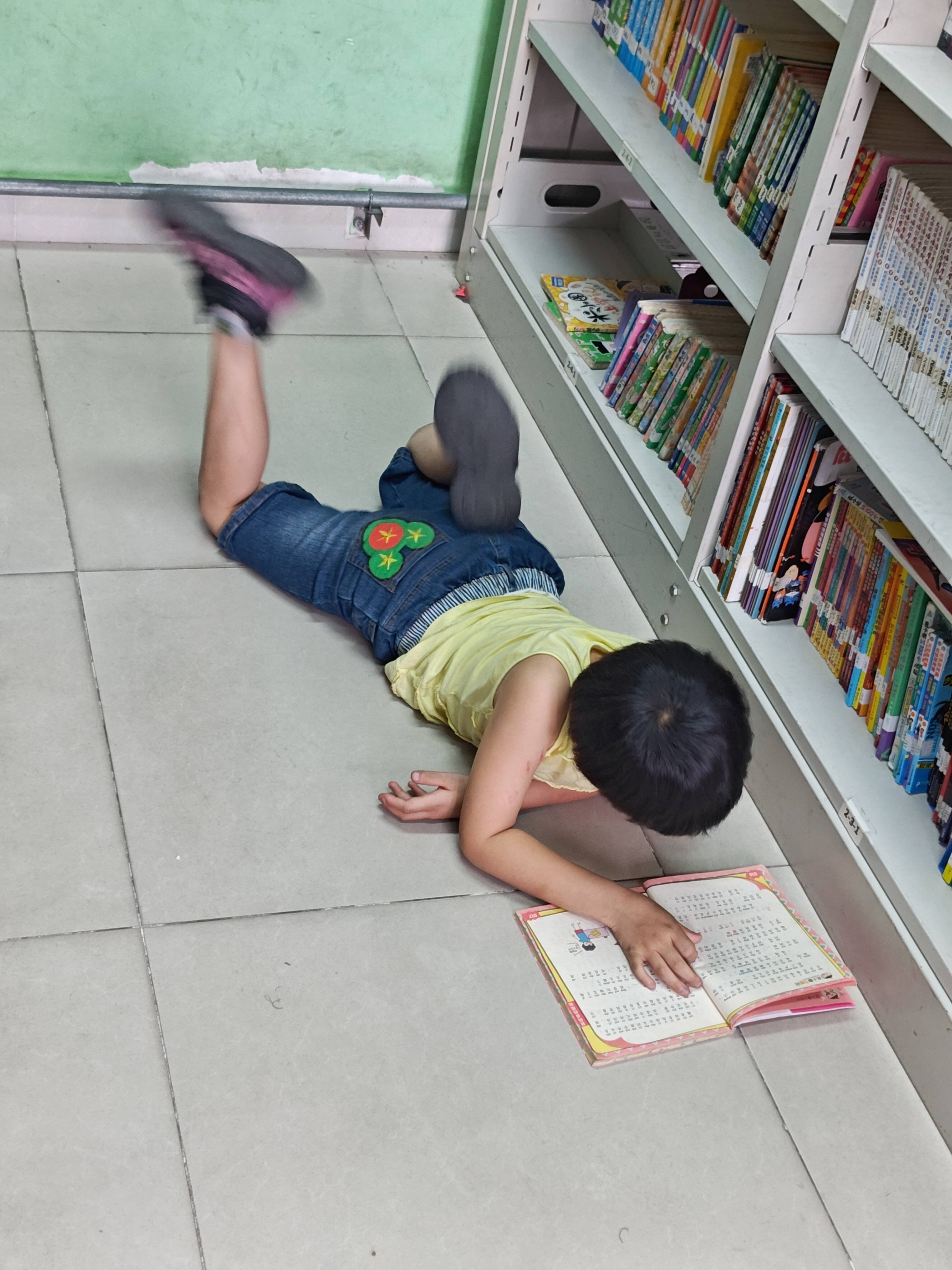 收拾完准备离开时,遇到一只趴在地上翘着脚看书的小可爱