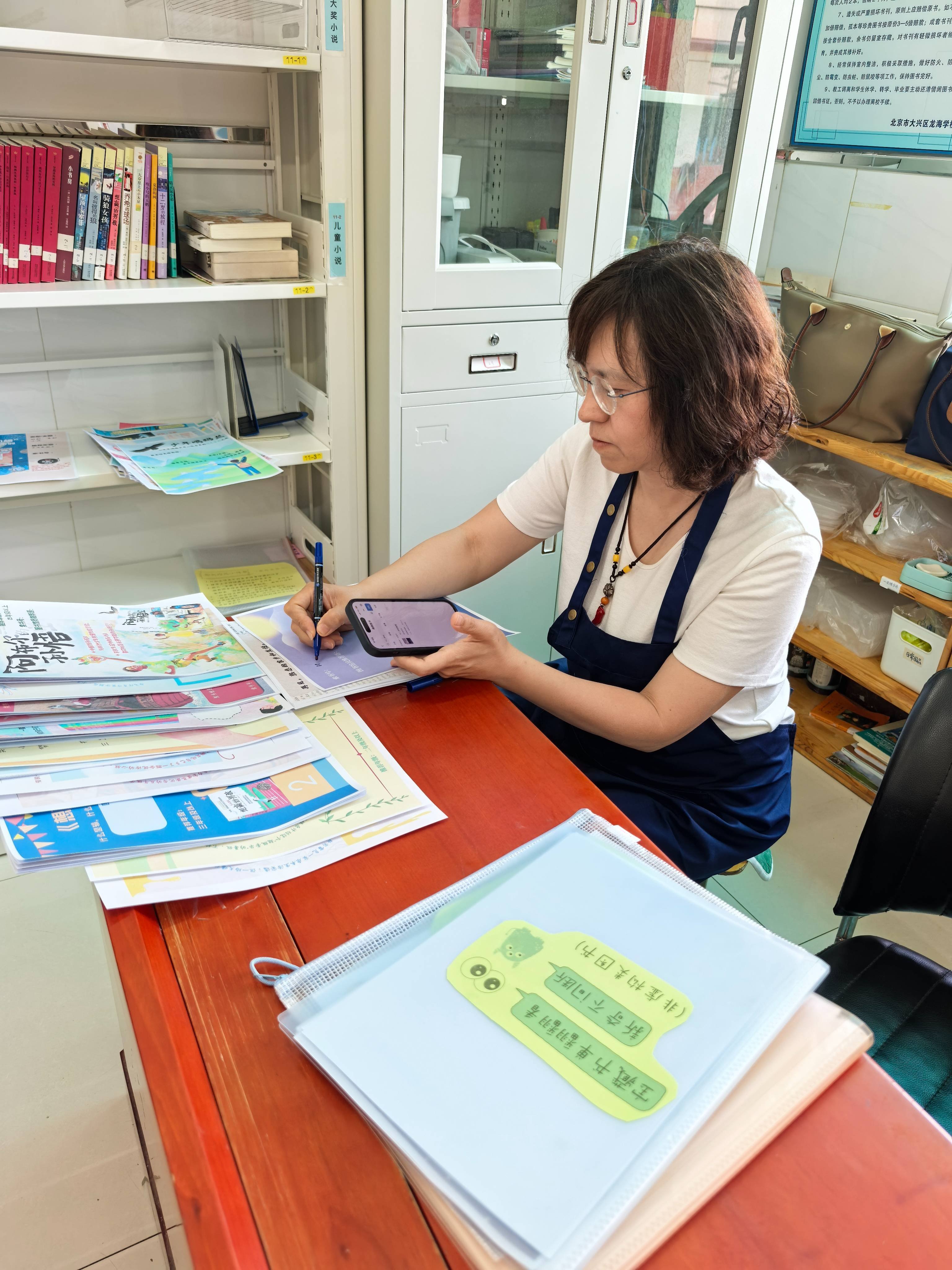 临近期末,本周开始还书,也许是因为周一是属于六年级学生,而六年级已经基本还完书,今天没有收到多少还书,还是有不少孩子来看书,有的同学知道这学期不能再借书很遗憾,还有同学问哪天颁奖,看来孩子们对期末阅读总结这个仪式还是很期待的。趁着今天空闲些,和朱玫老师把总馆的宝藏书单整理了一下,馆藏有的写上索书码放到文件夹方便以后孩子们翻阅,没有的放回袋子里。期间发现有几本书有复本,有的甚至不止一本,因为索书码不同已经单独放在靠近工作区的架子上,请刘佳老师酌情处理。六年级的ZJ拿着一张活页纸来馆里,请我们签名,她是一个热情开朗的孩子,爱读书也热心在馆里帮忙,祝她前程似锦。