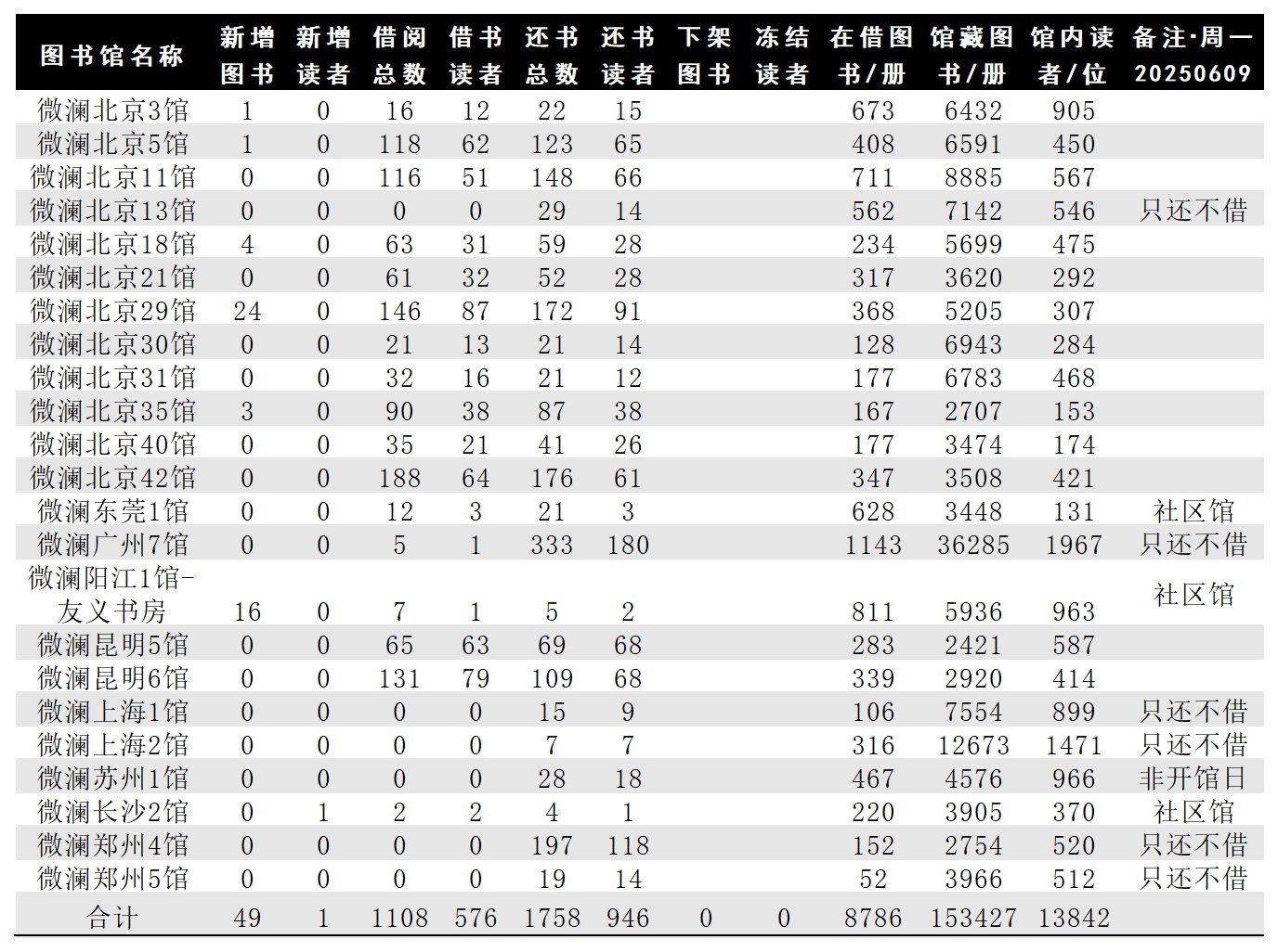 22家馆开放(6家只还不借),为576位读者借阅图书1108册次,处理归还图书1758册(946人次);购买/受捐/学校馆藏等录入上架图书49册,新增读者1位。