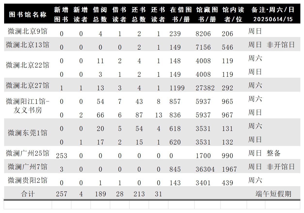 6家社区馆开放,广州25馆继续录入图书,为28位读者借阅图书189册次,处理归还图书213册(31人次);购买/受捐/学校馆藏等录入上架图书257册,新增读者4位。