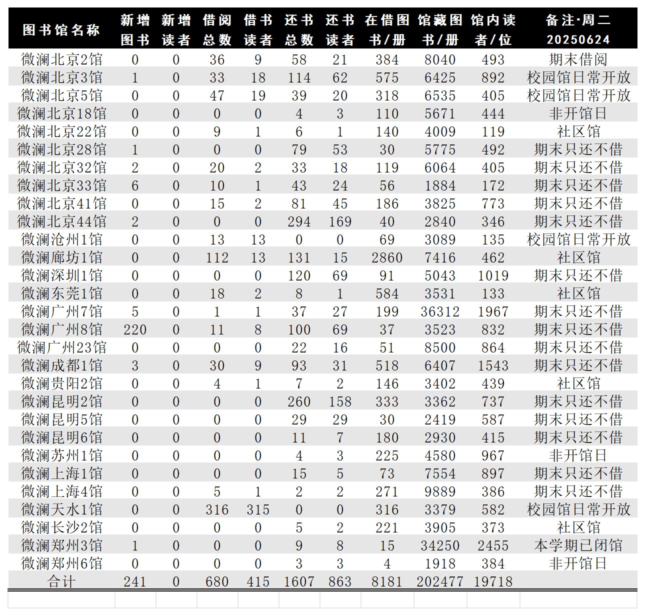 26家馆开放,为415位读者借阅图书680册次,处理归还图书1607册(863人次);购买/受捐/学校馆藏等录入上架图书241册,新增读者0位。