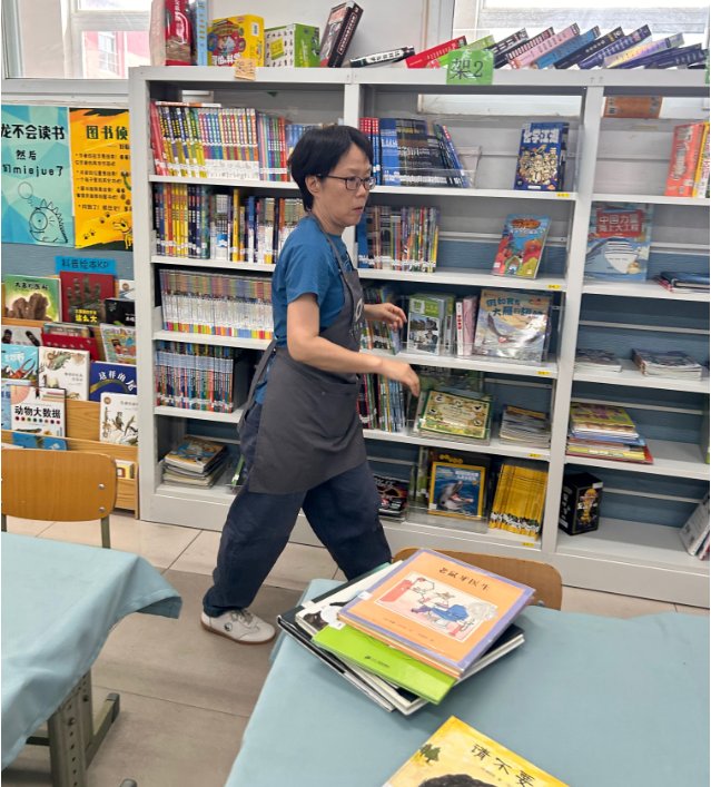 今天去32馆和罗辉姐、晓蕾老师、荣丽老师一起值班,和荣丽老师在这个学期完美错过,这是唯一的一次同时值班的机会,很开心。罗老师手脚很利落,满眼都是活,太勤快了。把库存的物品进行了清捡,在罗老师的带动下,我也一起帮忙;晓蕾老师一直在做破书修补的事情,不去,一年级讲了绘本;荣丽老师去各班催书以及处理一些其他事务。