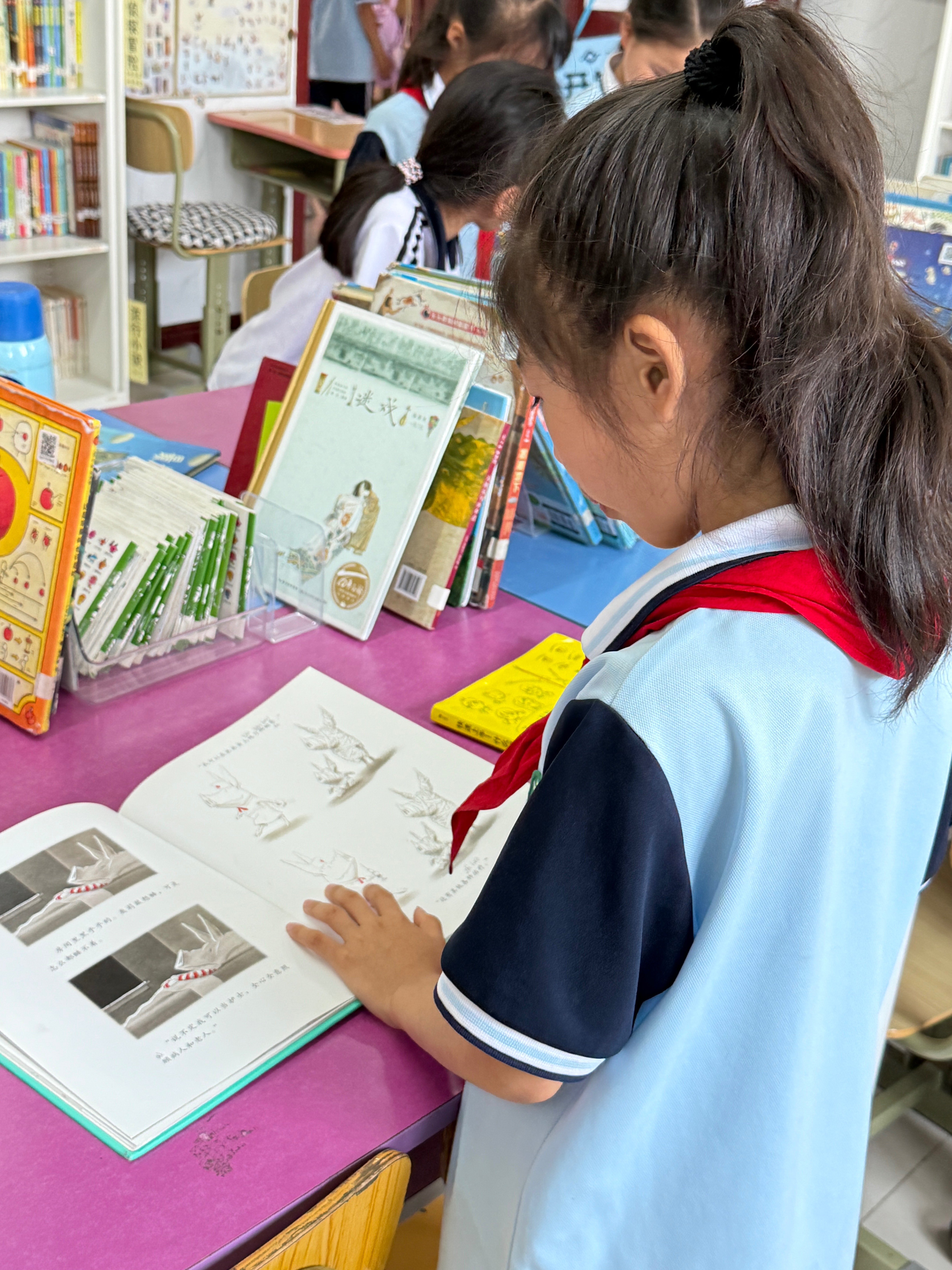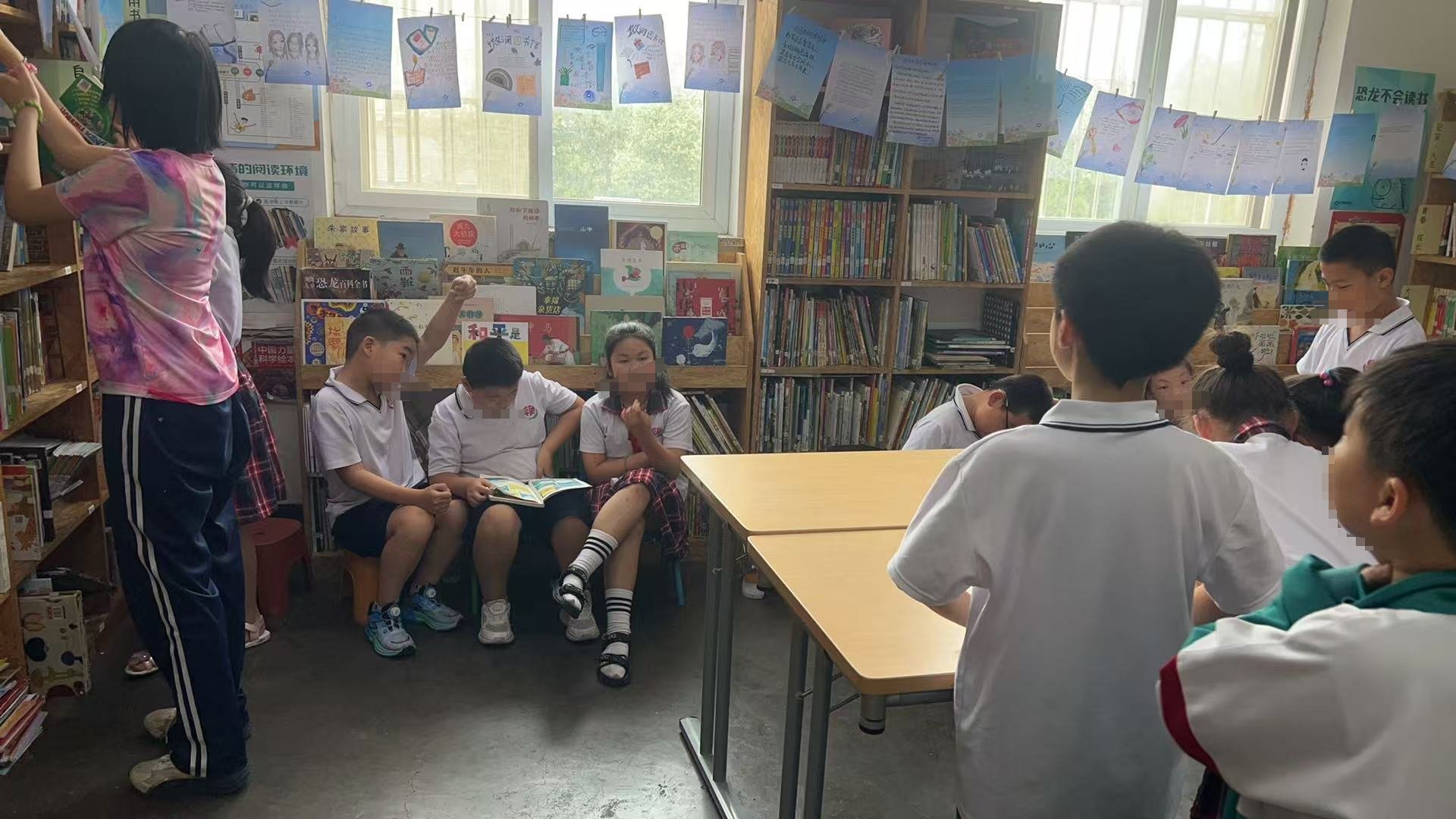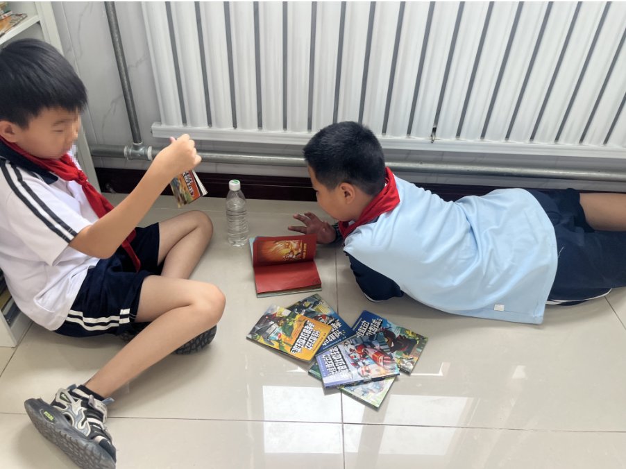 临近期末,孩子们尤其是低年级的同学,状态还不错,可能是要放暑假了。都特别勤快的来图书馆,几乎每个课间都有人来。大部分同学还是认真看书的。课间戚老师也和孩子们聊一会儿。有几个同学体育课又来馆里了,提醒后人不舍得离开,最后又是被老师叫走的。