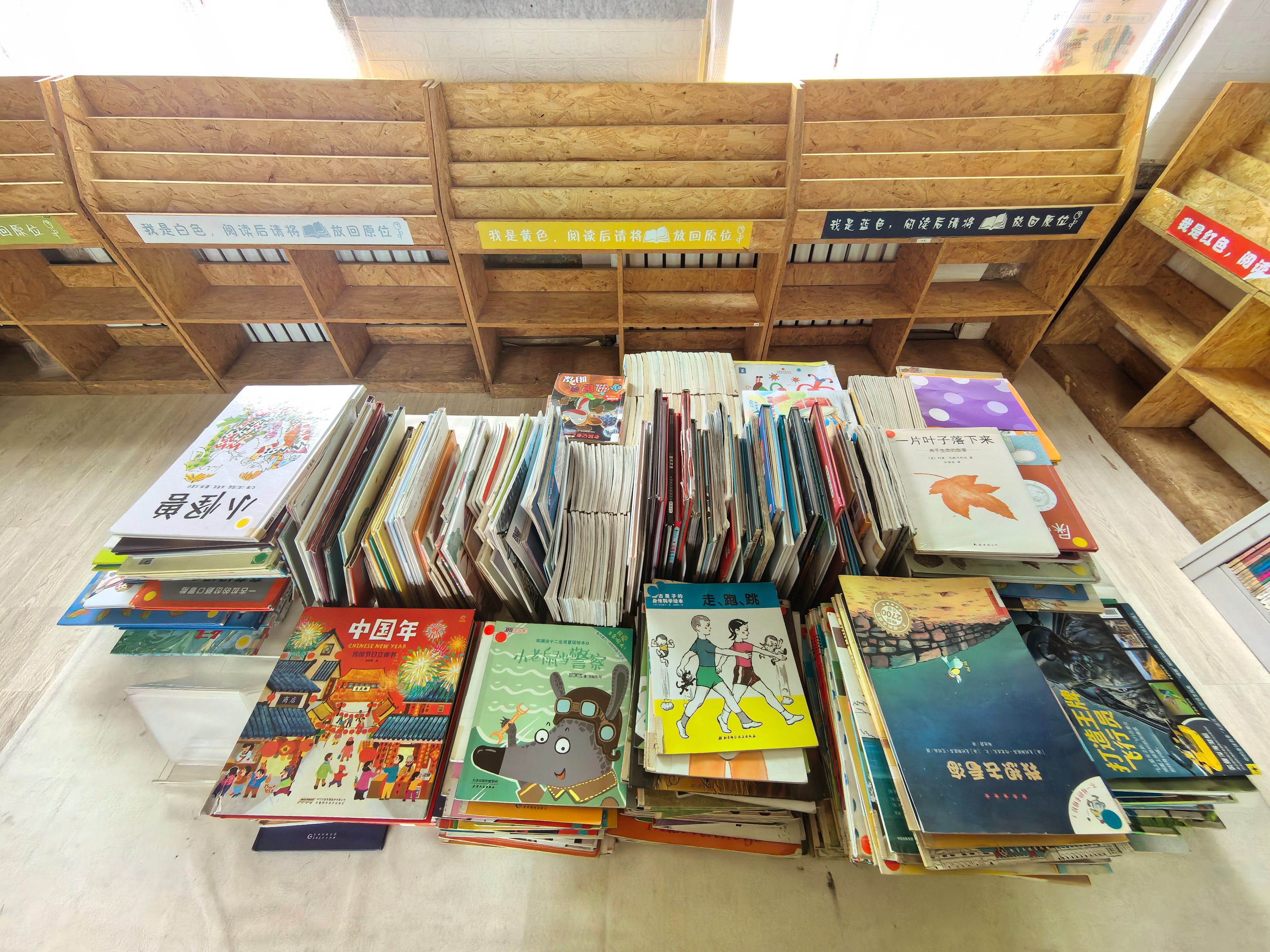 下午孩子们一上课,便开始整理书架,把绘本架上的书全部搬到桌子上,基本上按类摆放整齐,书架上的书也检查整理了一遍。