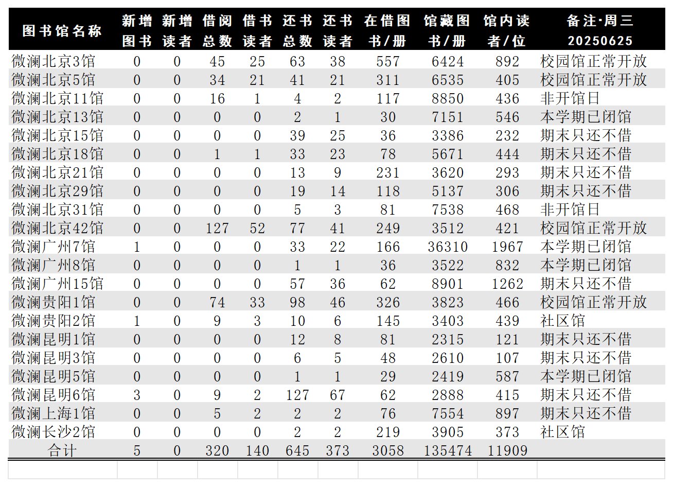 18家馆开放,部分只还不借,为140位读者借阅图书320册次,处理归还图书645册(373人次);购买/受捐/学校馆藏等录入上架图书5册,无新增读者。